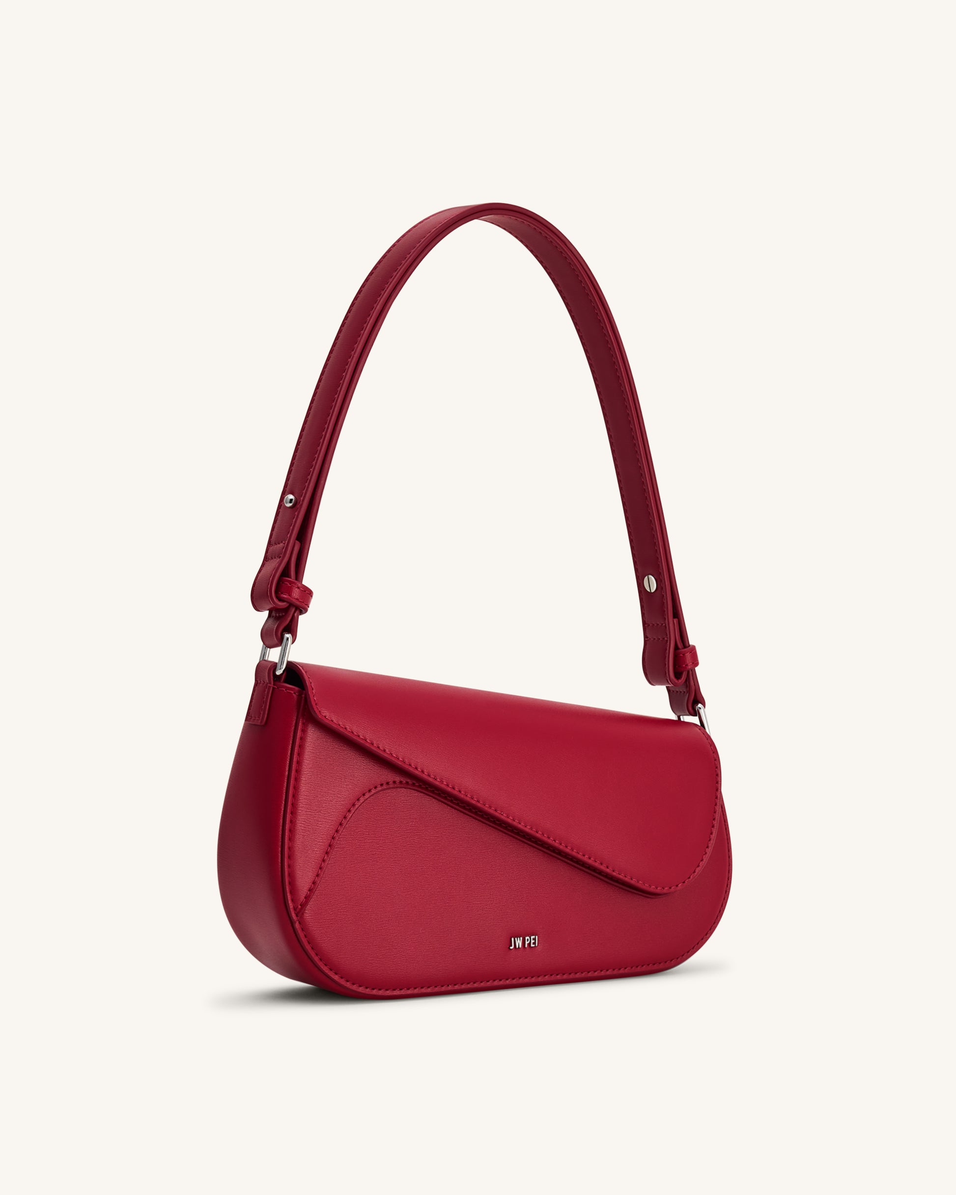 線條俐落的紅色素皮革包,極簡輪廓設計。可調節單肩帶增加靈活性。銀色五金襯托鮮明色彩。適合日夜場合使用。