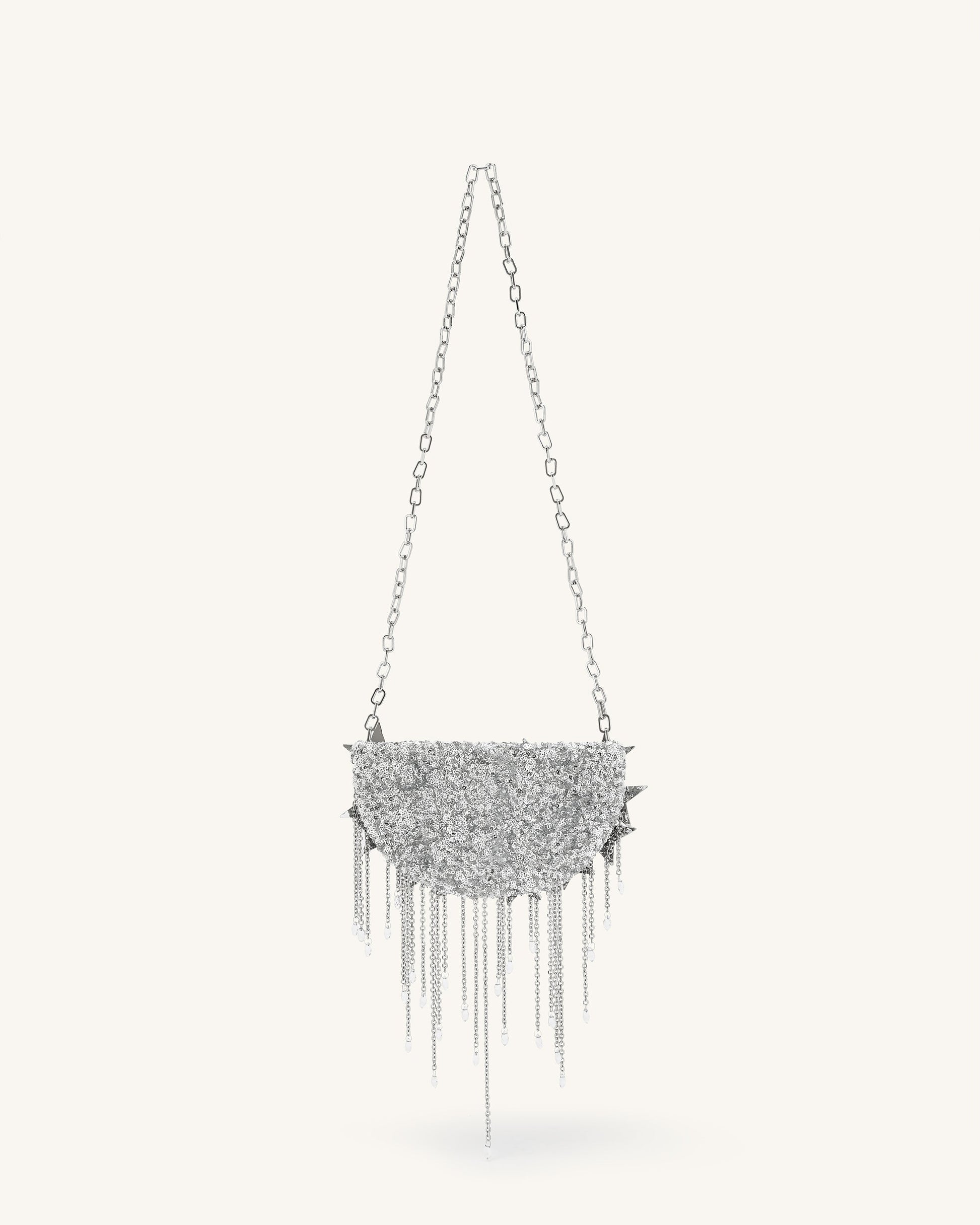 介紹這款星星裝飾鏈條包,它是一款閃耀且以星空為靈感的配件,完美展現大膽的風格。此包擁有精緻的星星裝飾和時尚的鏈條肩帶,是任何場合下的亮眼單品。