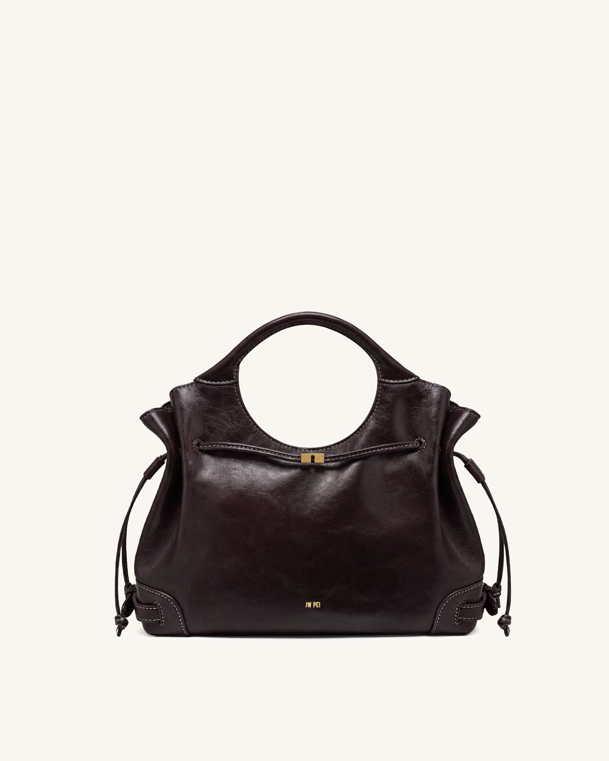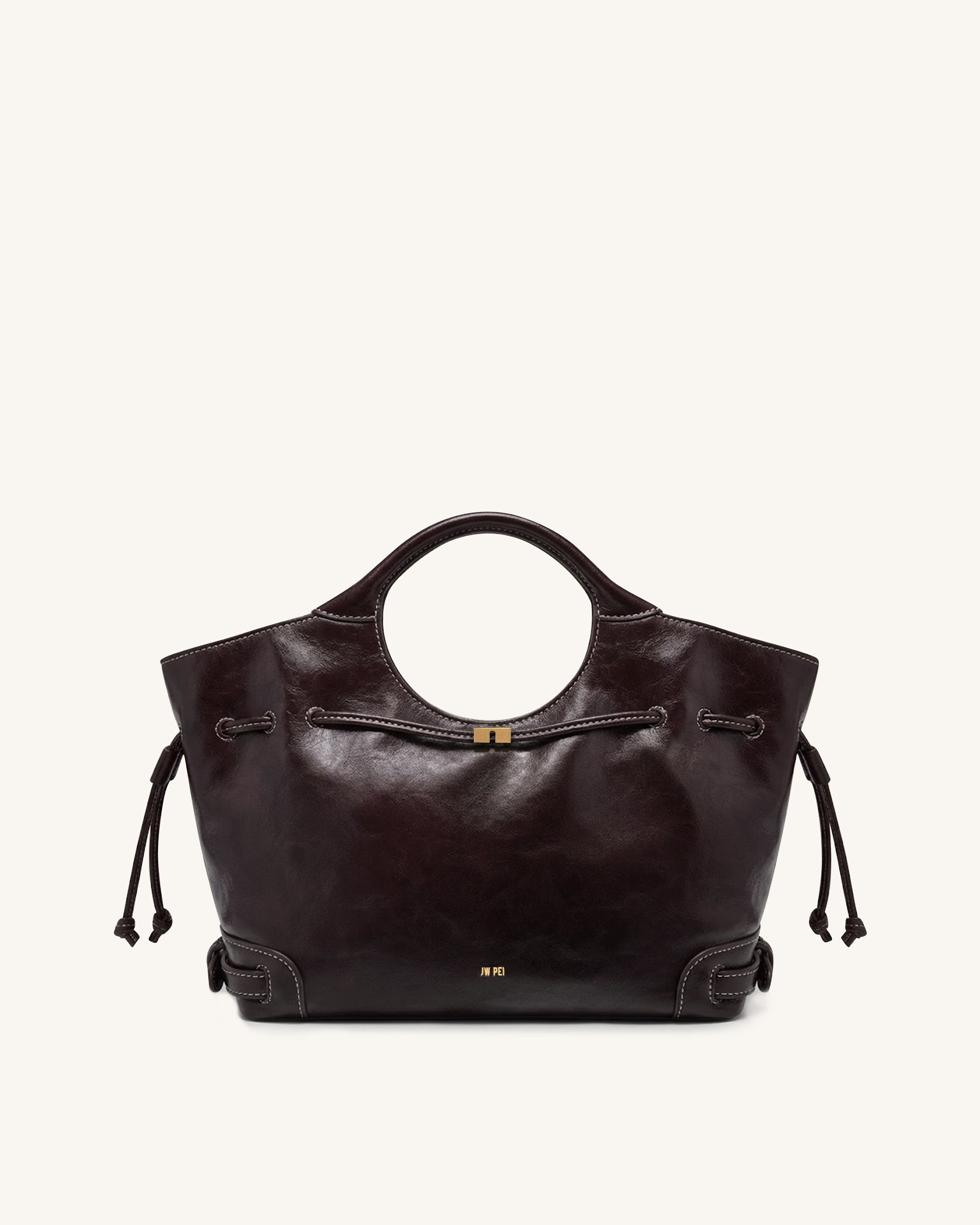 Elara 蠟面純素皮革抽繩托特包 - 深棕色