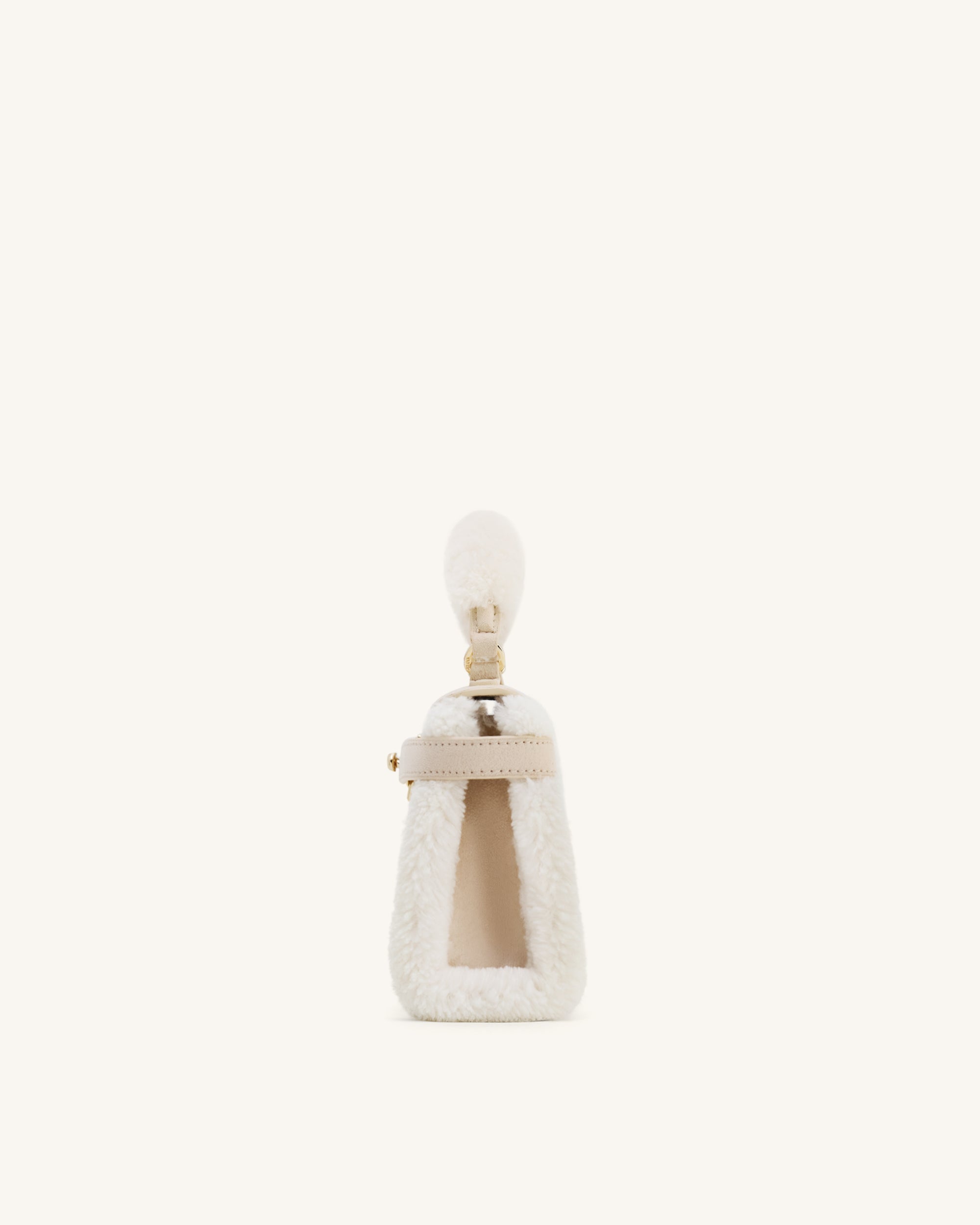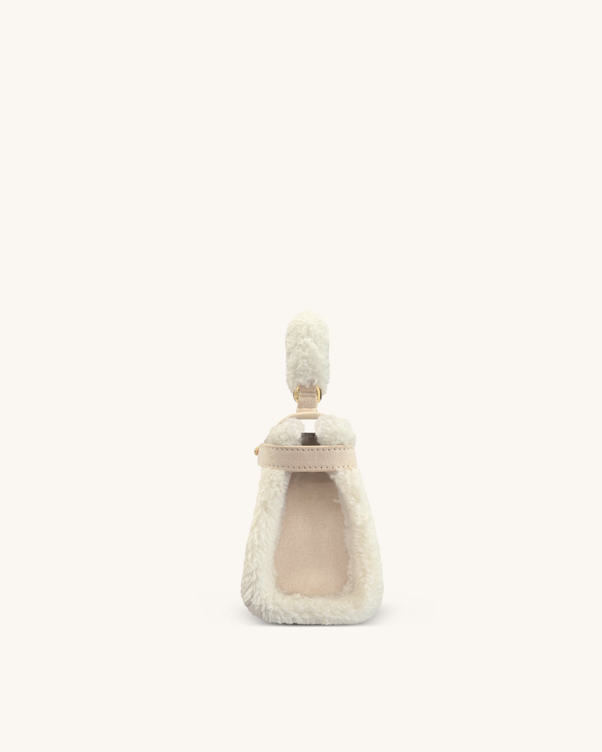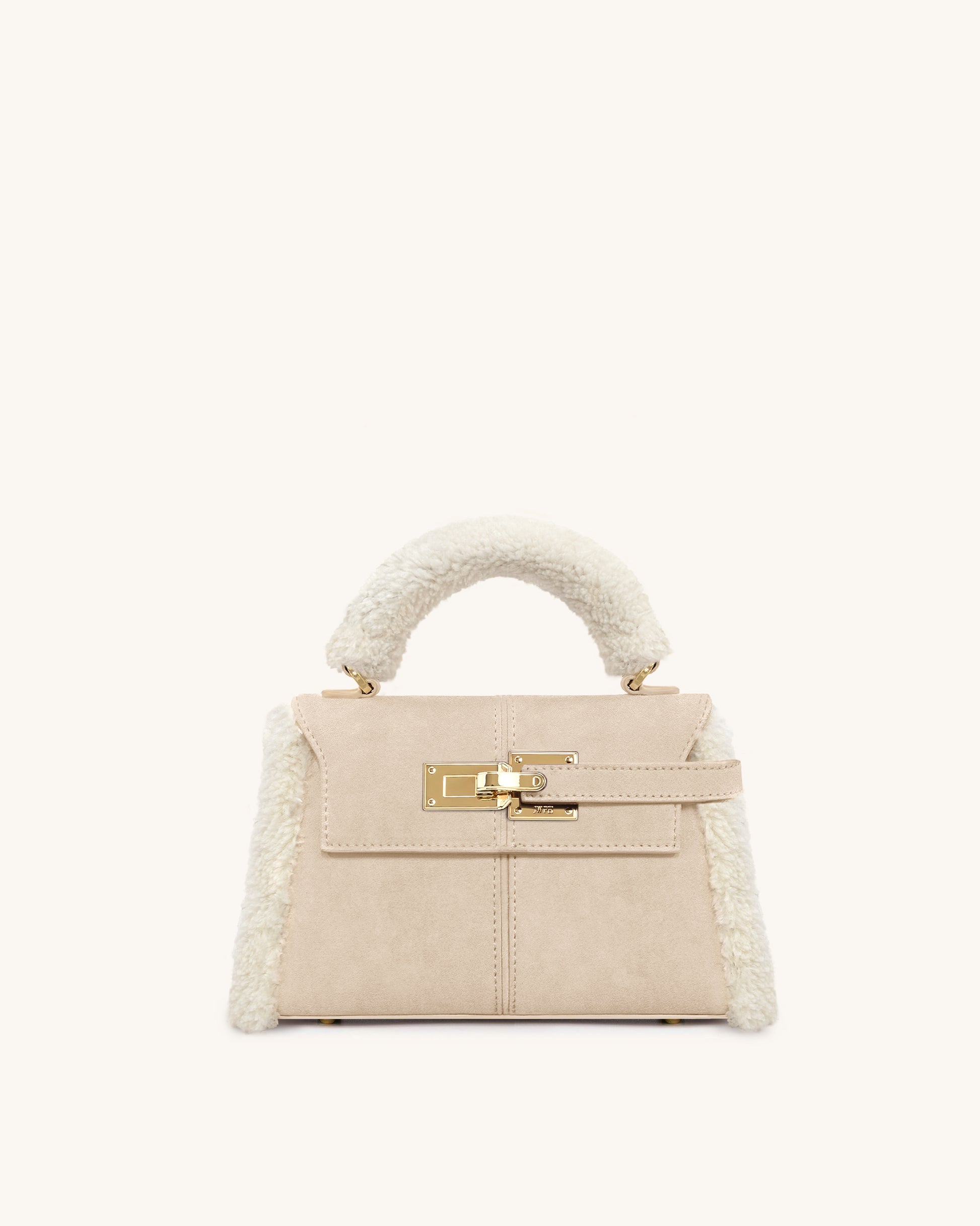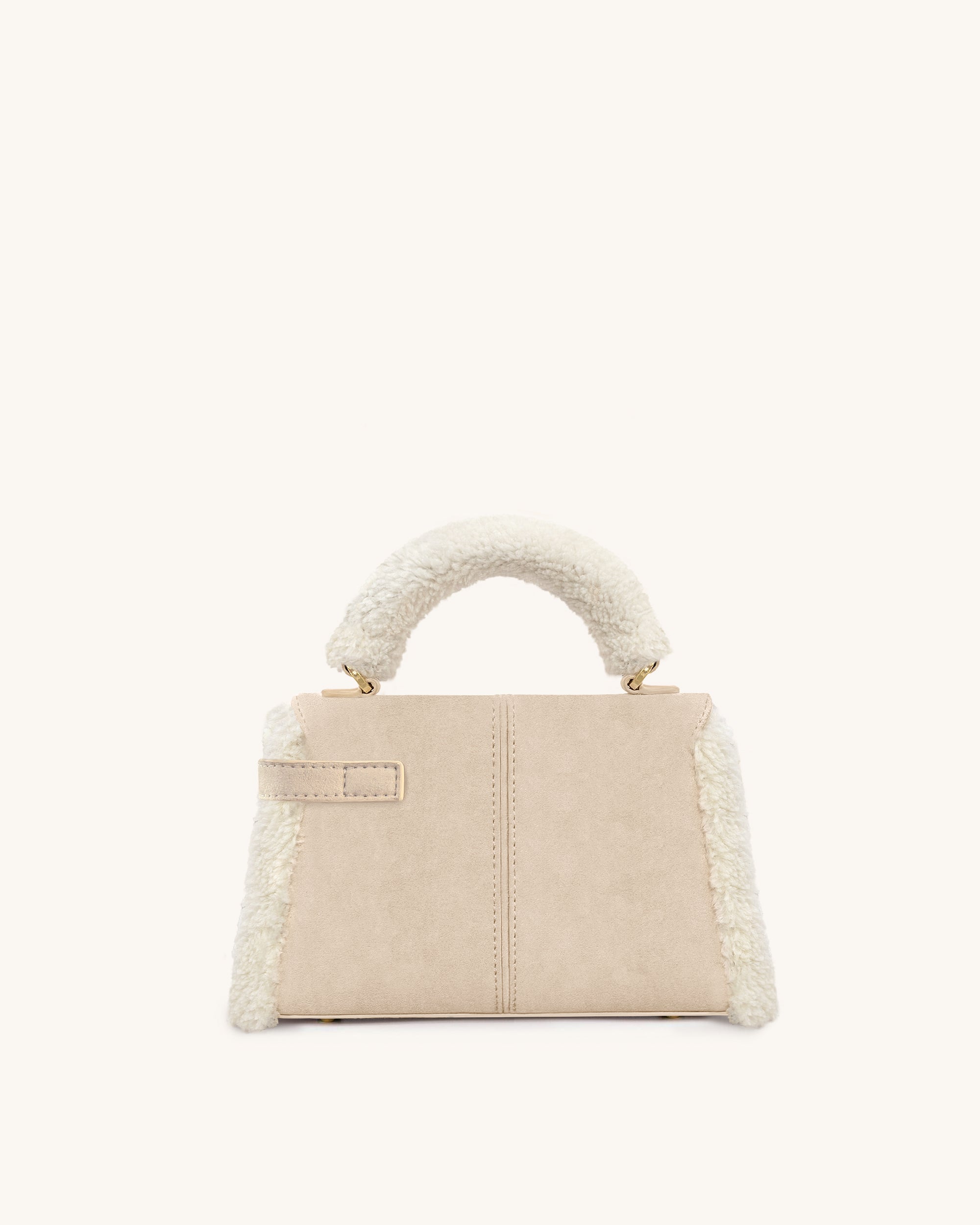 時尚挺括的灰褐色仿絨面迷你袋。柔軟羊羔毛細節裝飾手挽及側邊。金色五金締造迷人質感。手挽或斜揹均宜。