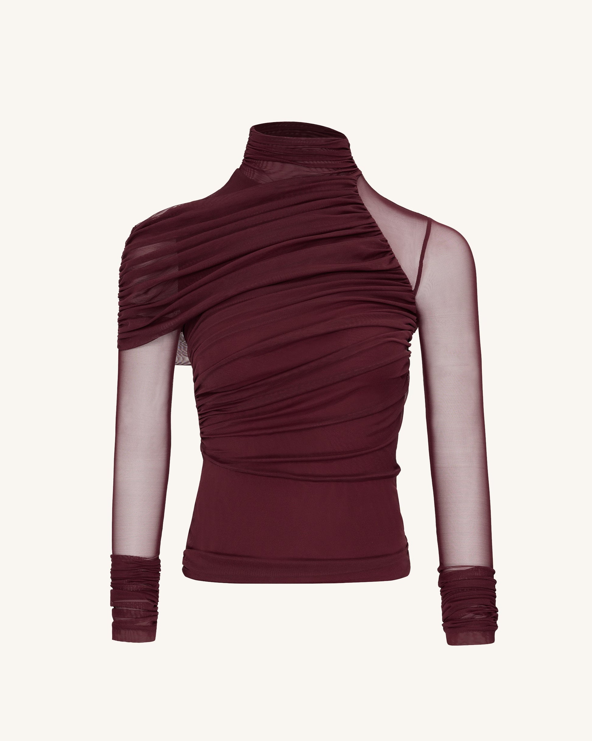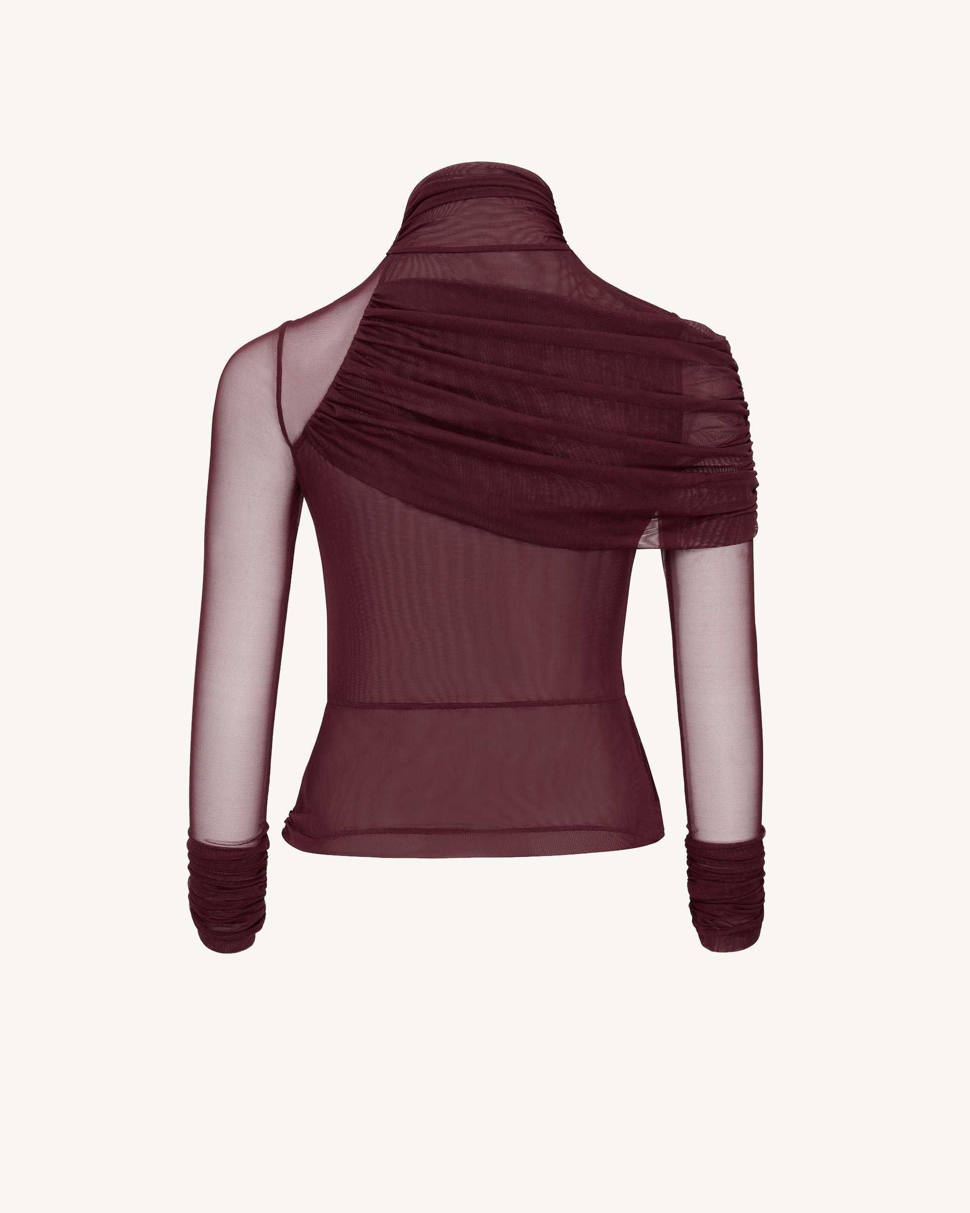 Ella 透視摺皺高領上衣 - 酒紅色