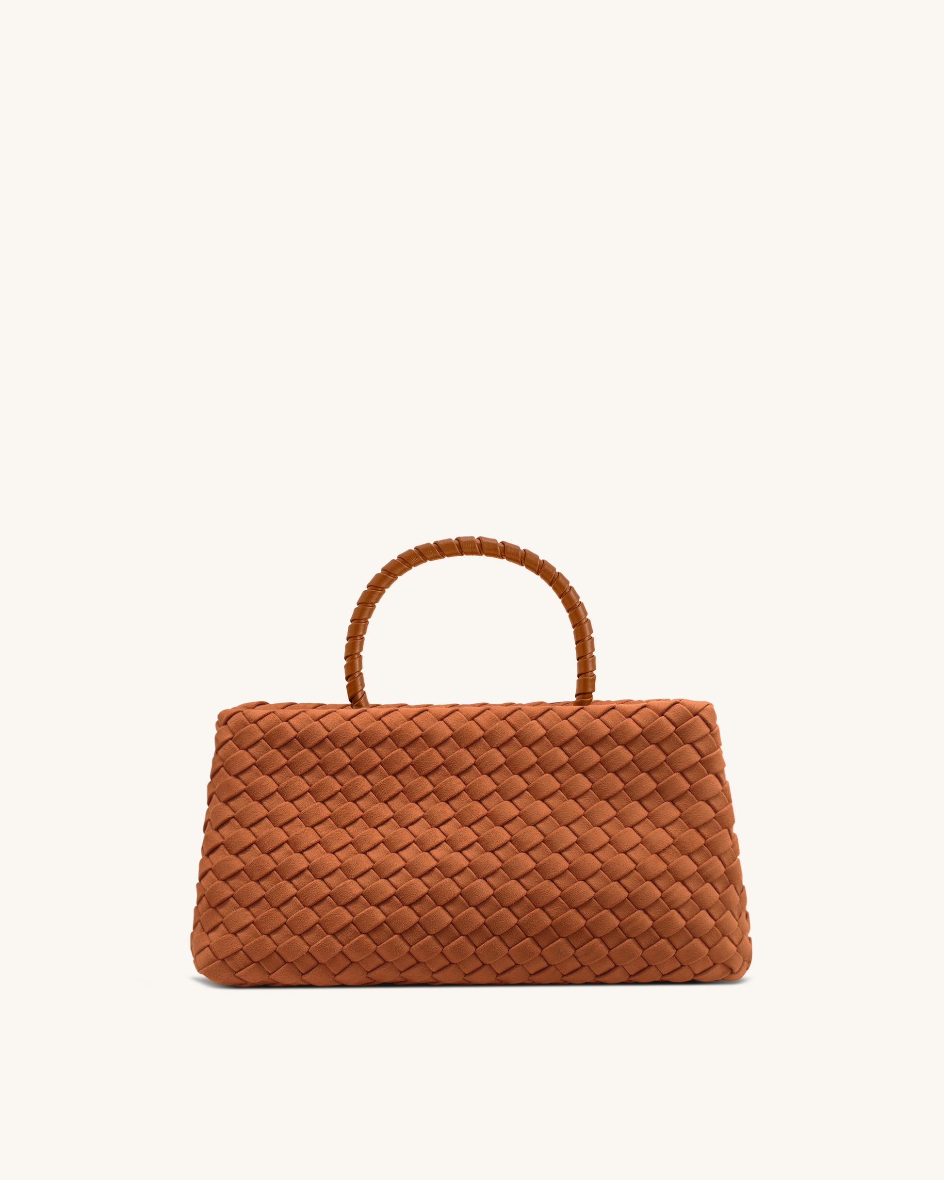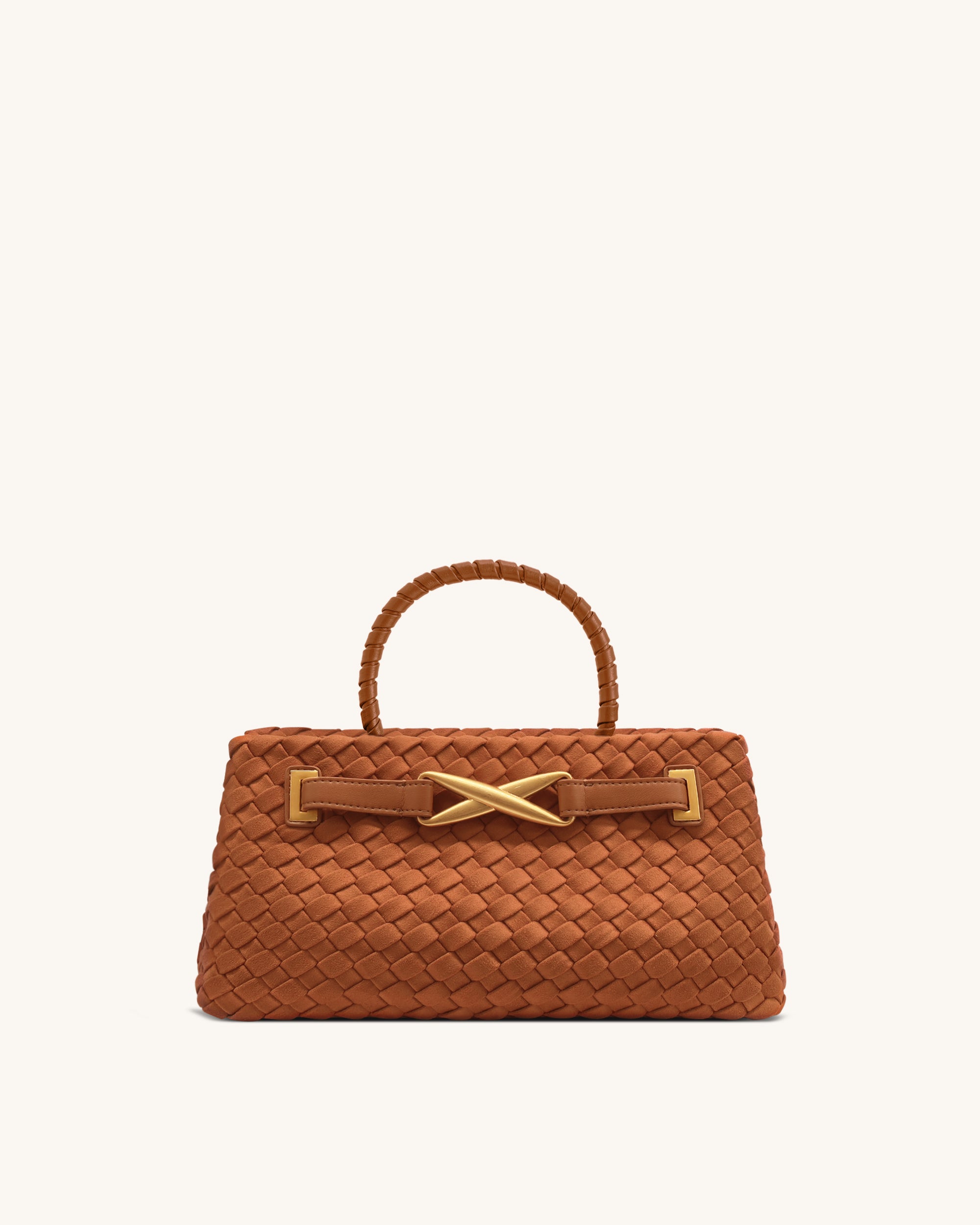 這款挺身手提袋以濃郁焦糖色呈現,配以手工編織紋理及優雅金色金屬配件,盡顯質感。X 字扣細節為經典剪裁添上現代感,是日常或正式場合皆宜的精緻之選。