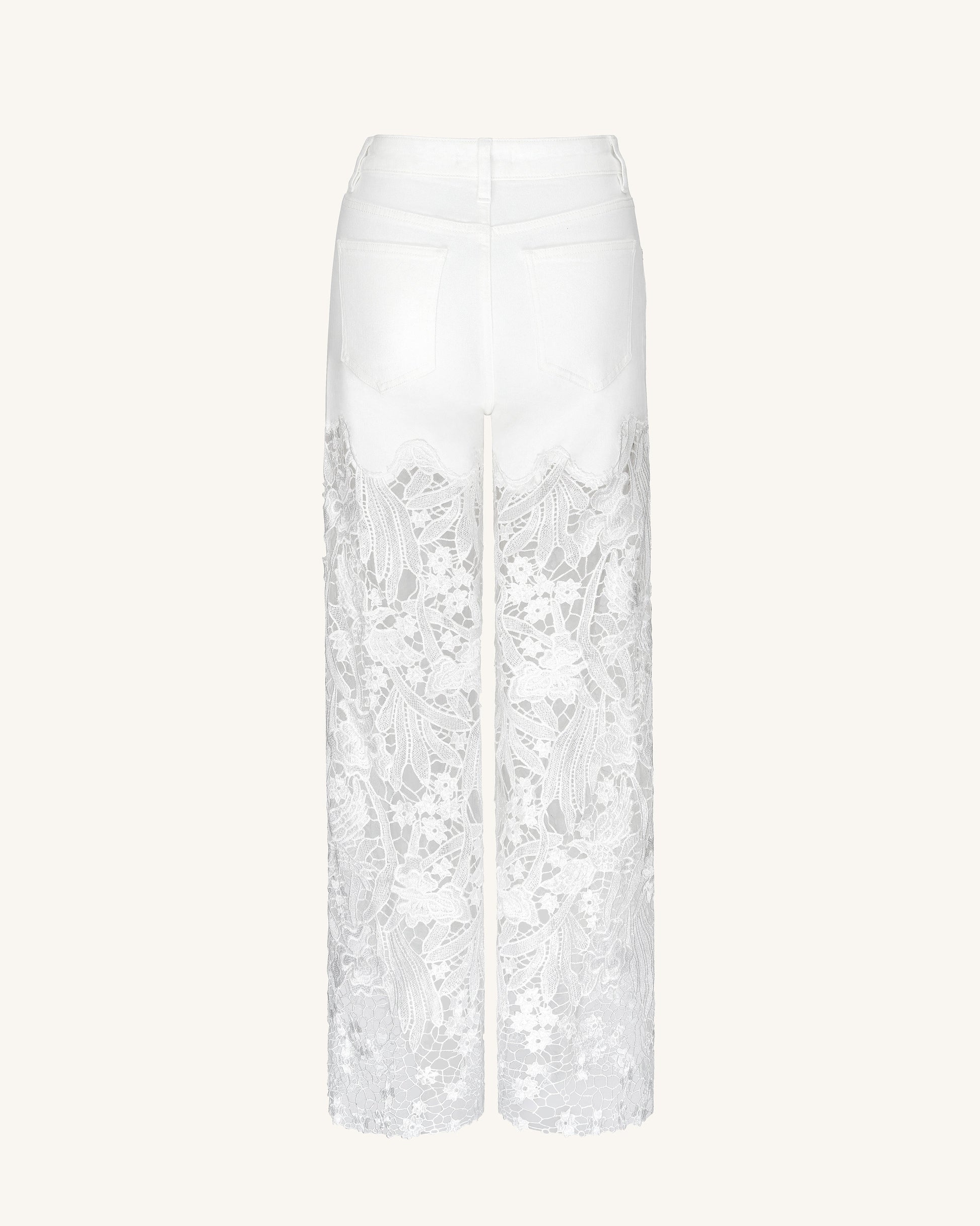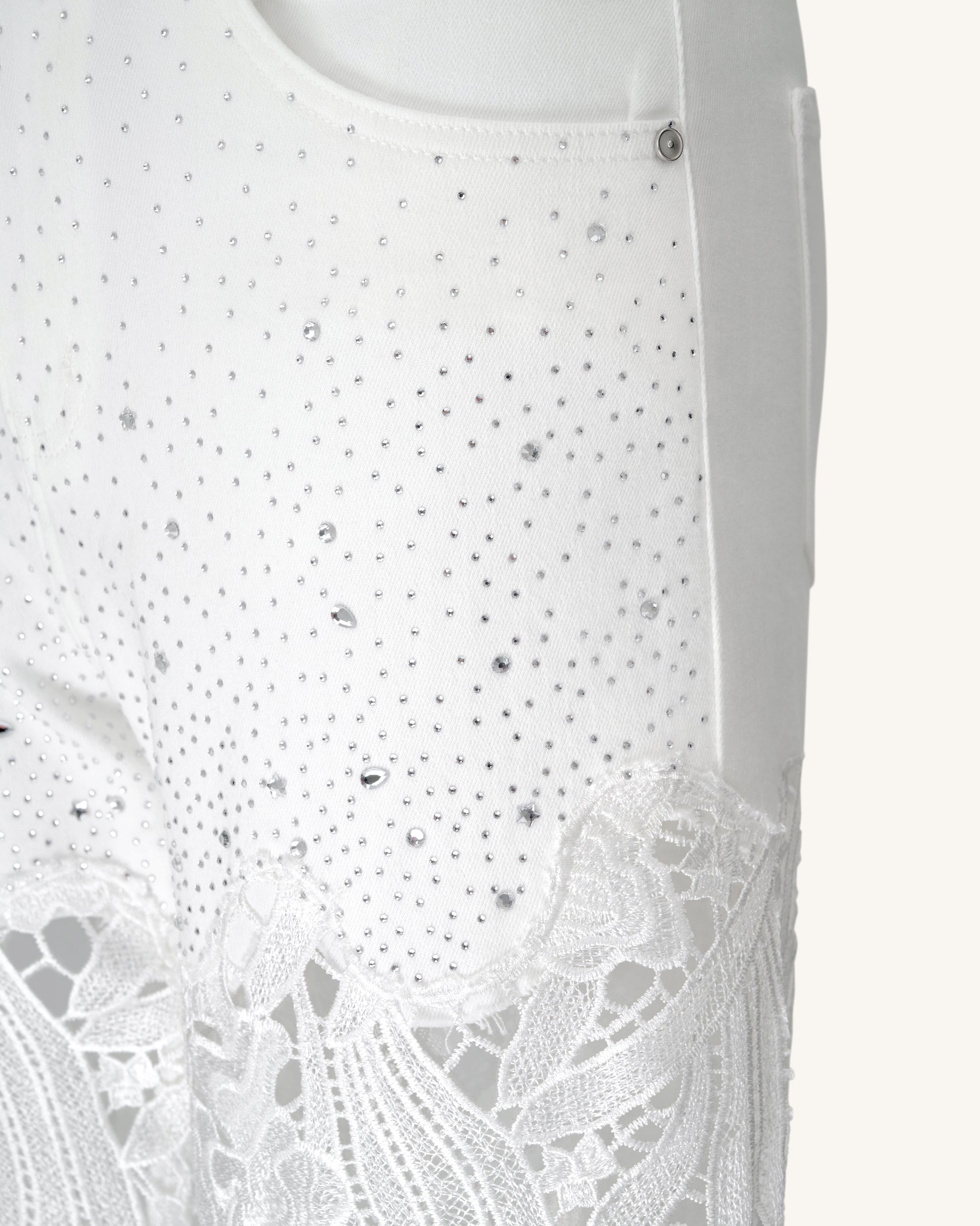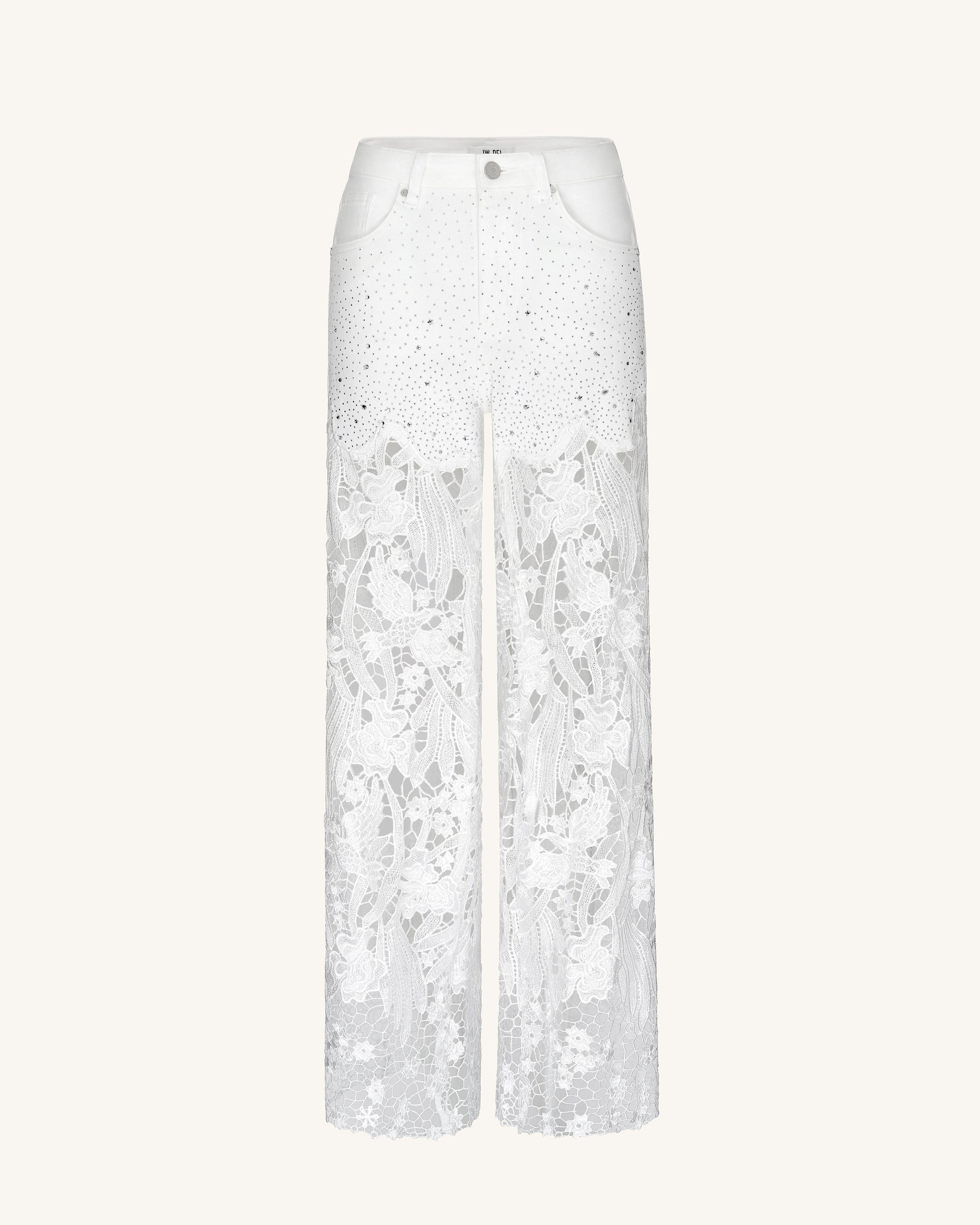 白色高腰闊腳蕾絲刺繡水鑽牛仔褲