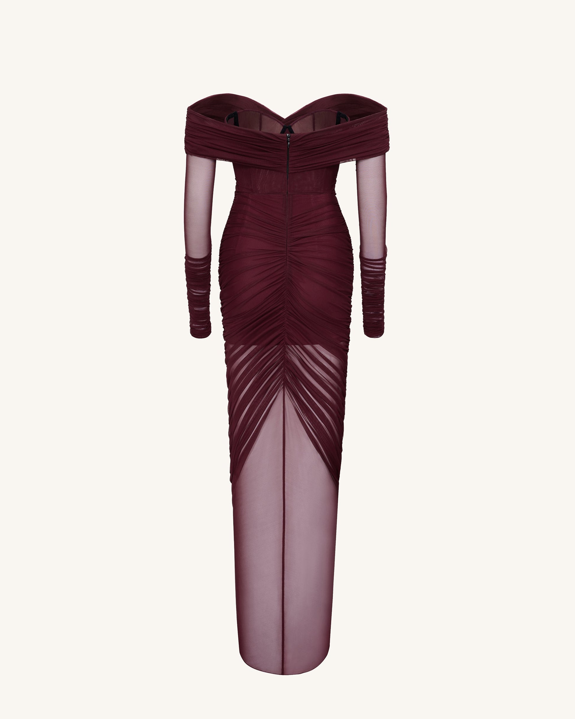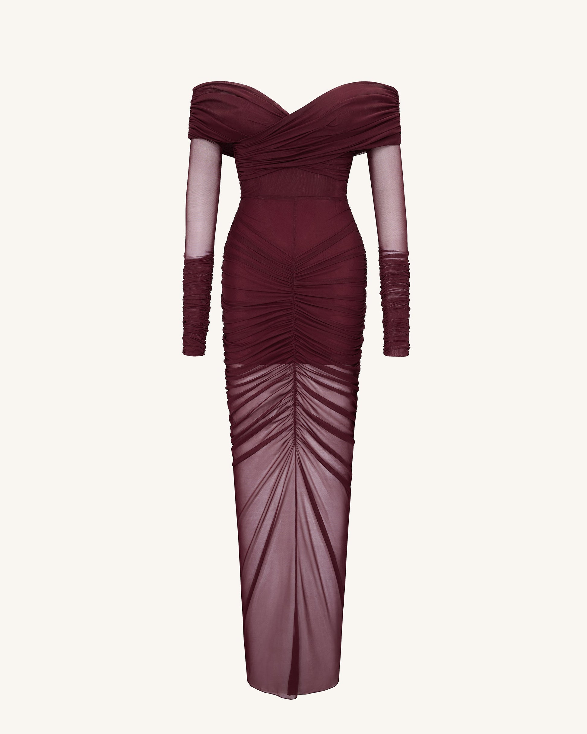 Emily 優雅露肩摺邊長禮服 - 紅色