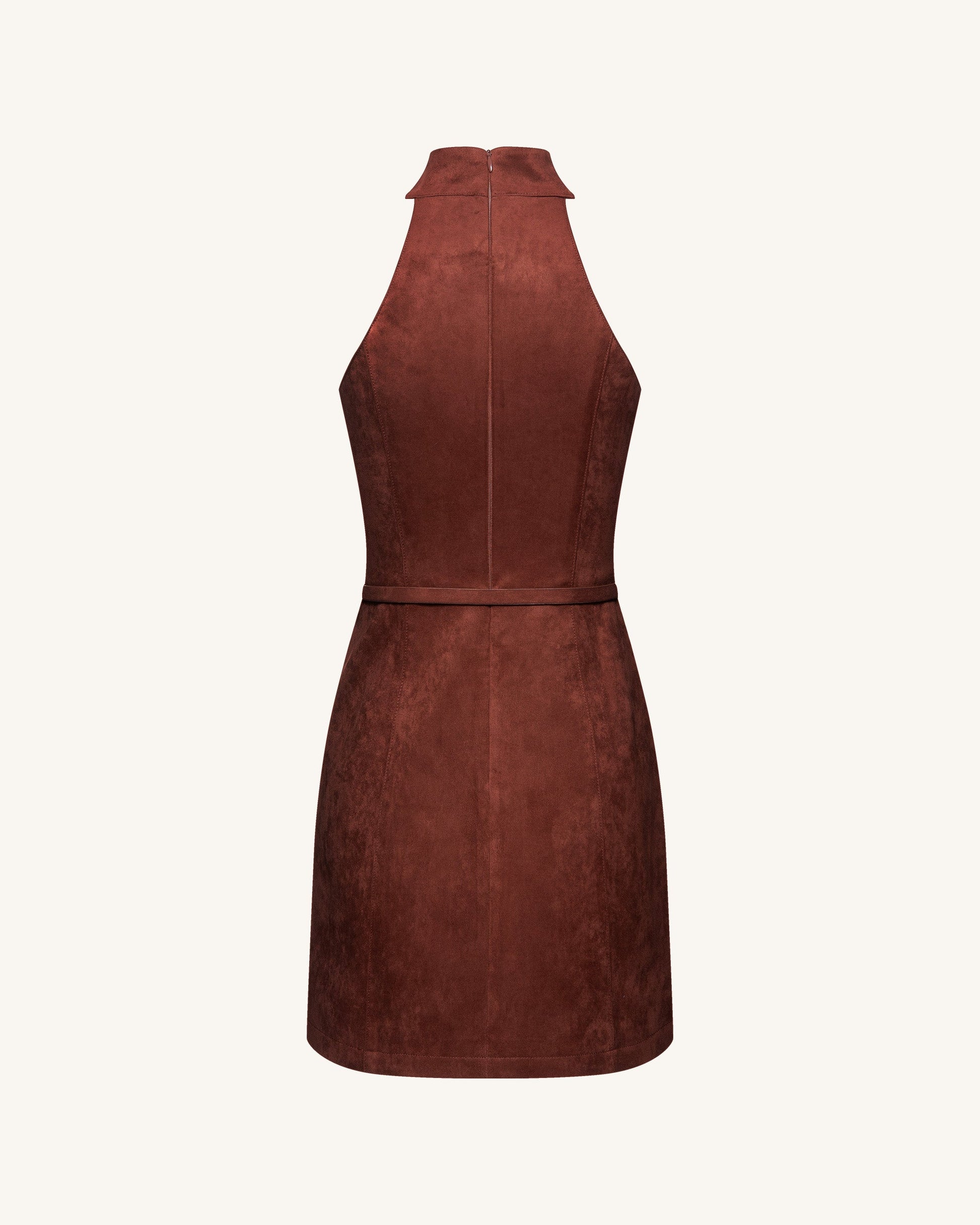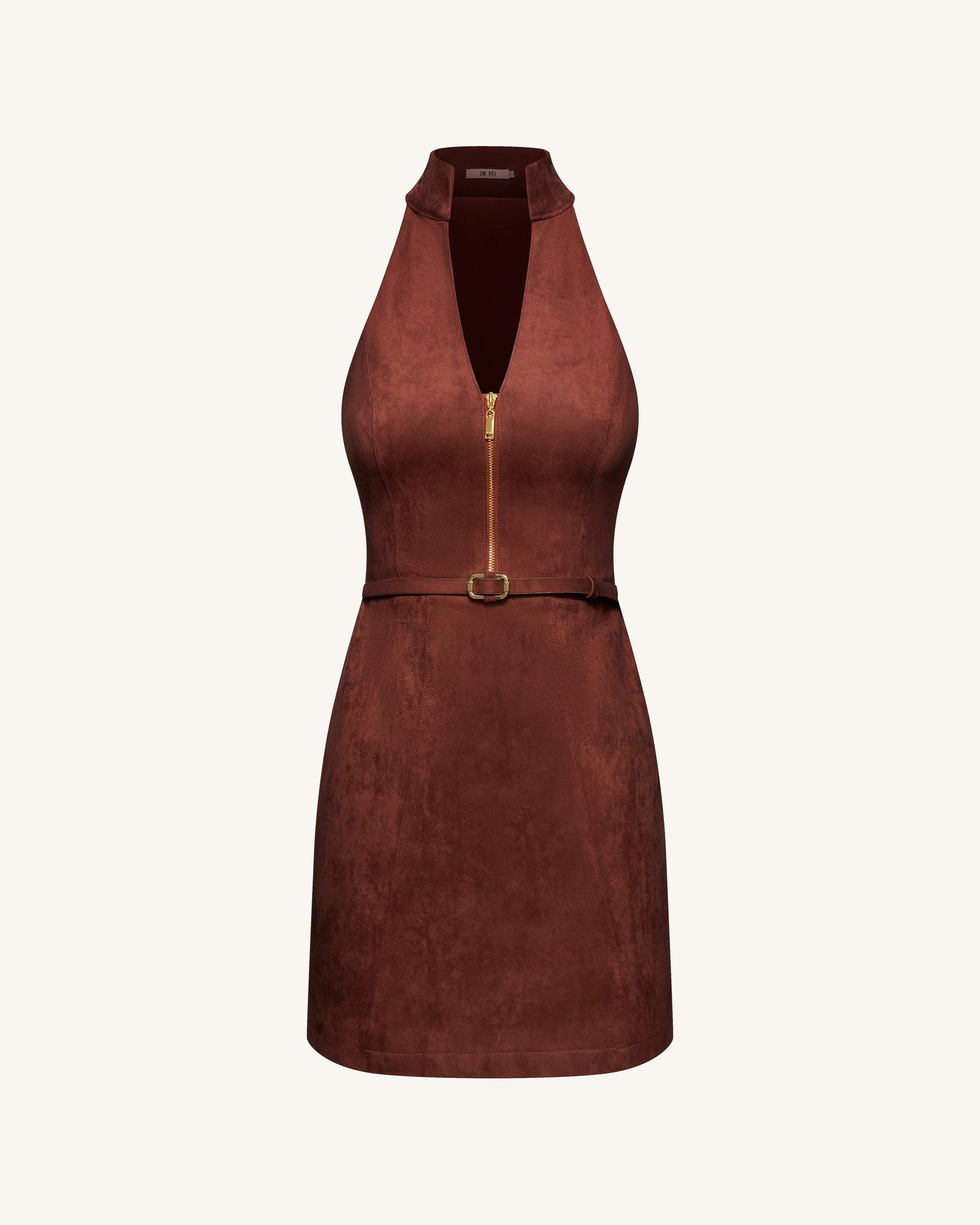 仿麂皮掛脖拉鍊前開迷你裙-酒紅色