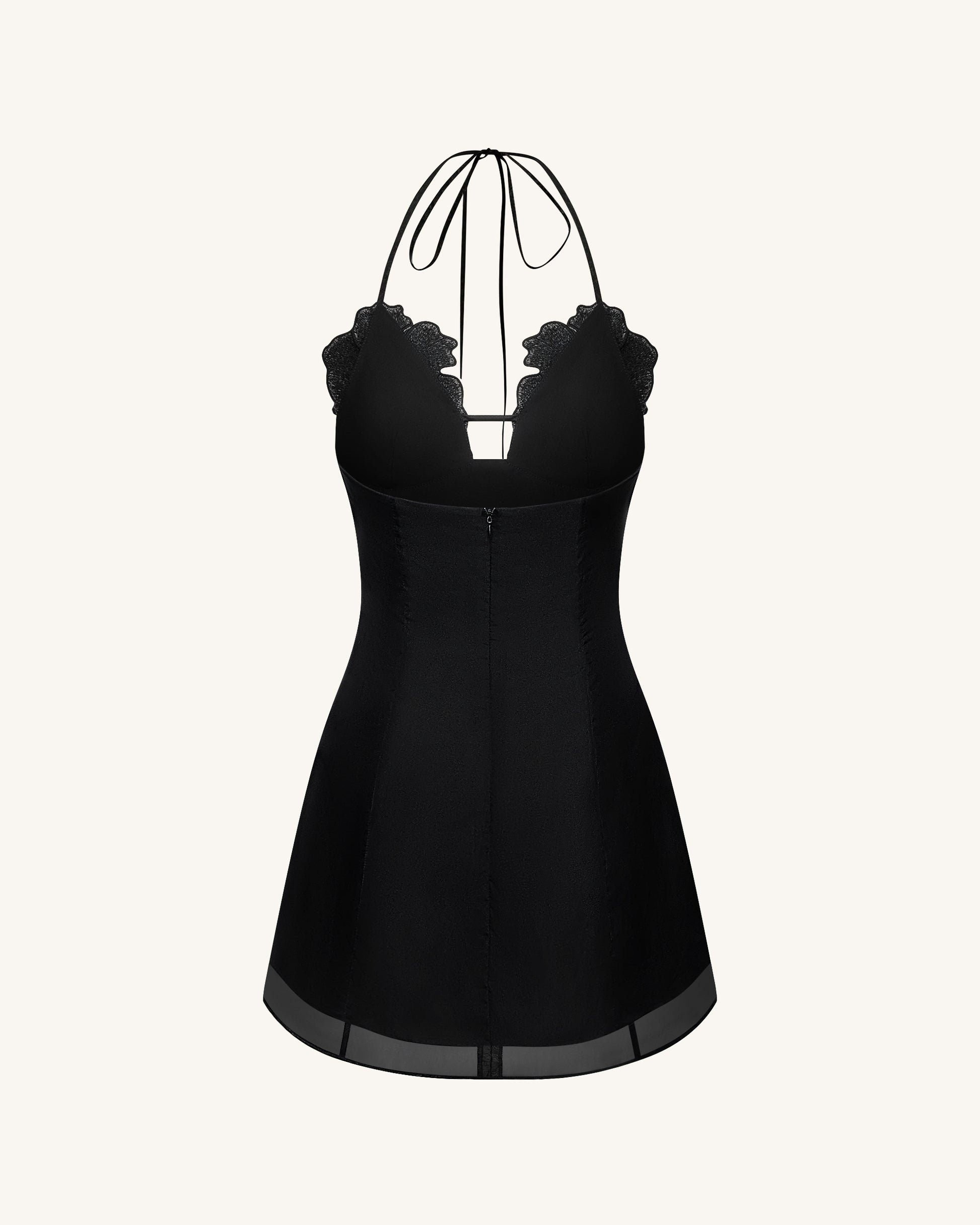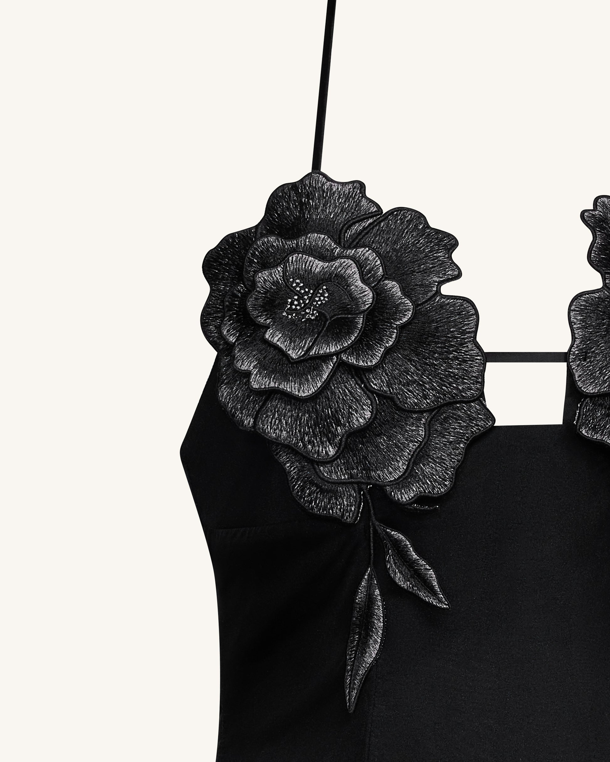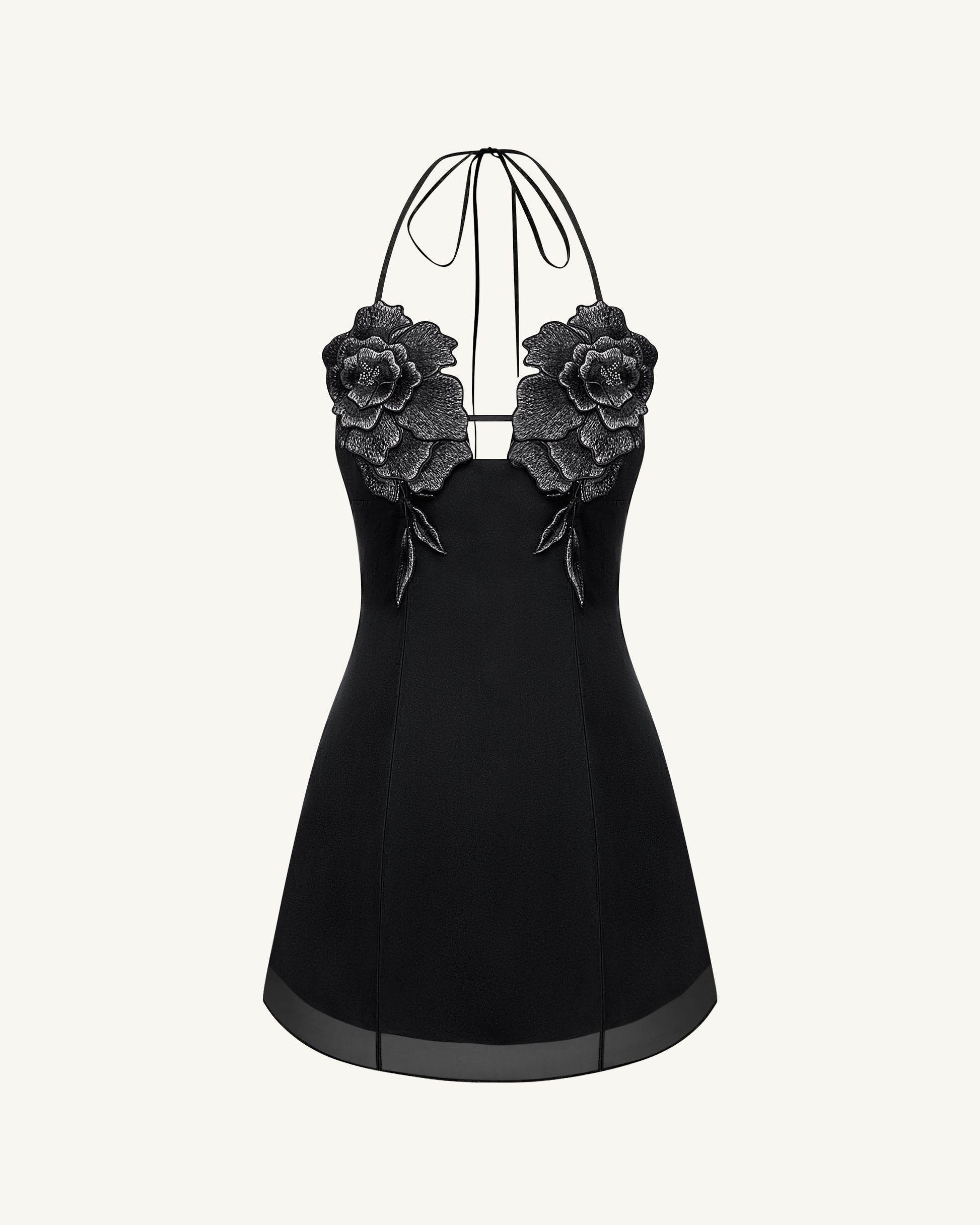 穿上這件黑色繞頸迷你裙,胸前設有誇張的3D立體花卉貼飾,讓你成為焦點。透視裙擺及修身A字裙型添上優雅感覺,綁帶繞頸設計可調節支撐力及散發魅力。非常適合派對、夜晚出街或造型突出時穿著。