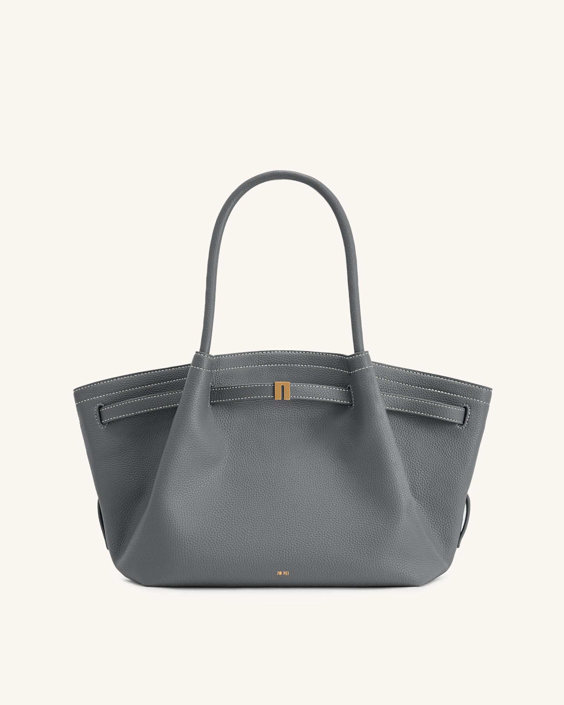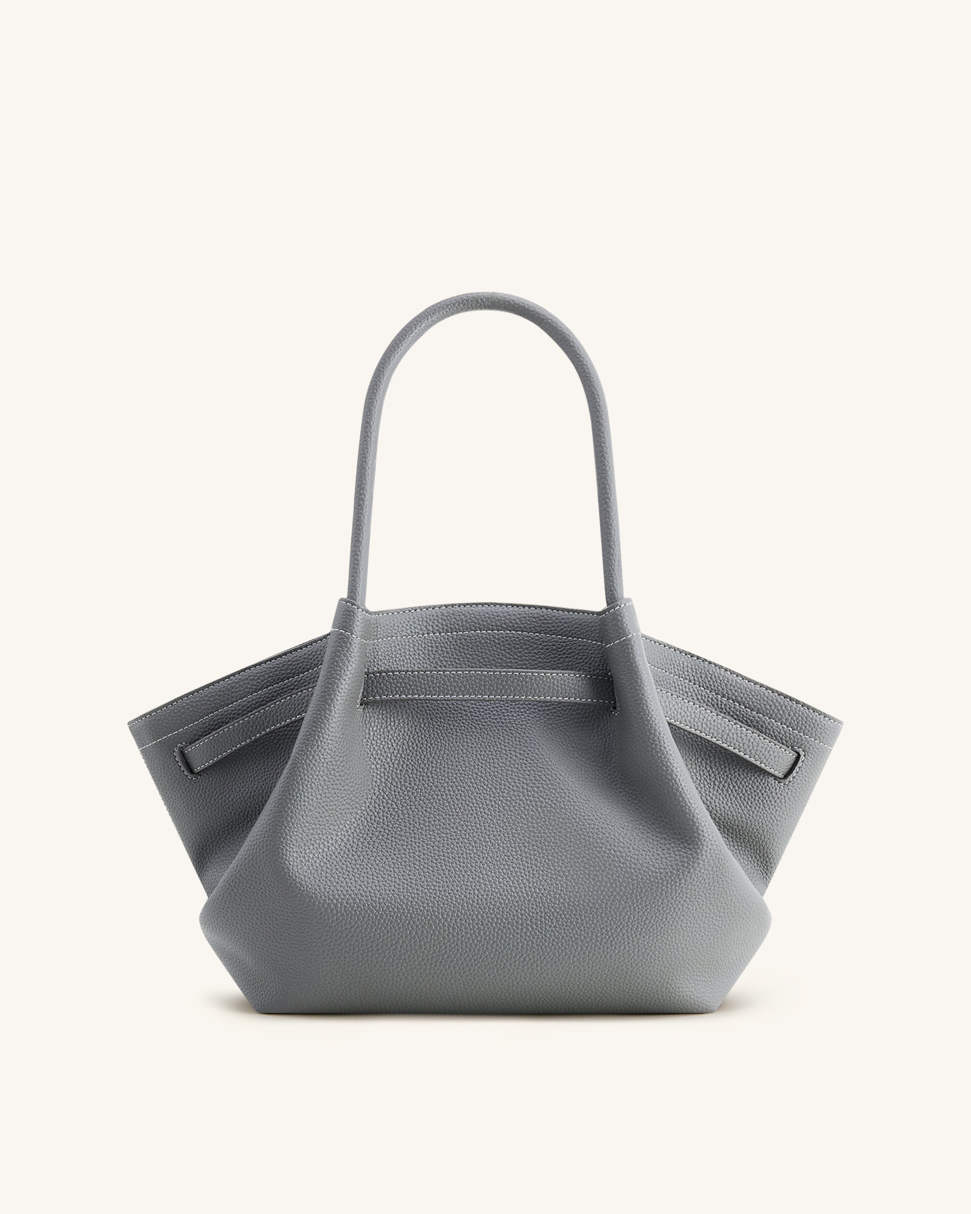 這款石板灰色的挺身托特袋,採用雕塑感梯形剪裁與細緻紋理,展現現代簡約的優雅格調。配備長手挽帶及磁石開合設計,容量寬敞,既實用又能為造型增添低調高雅的氣息。