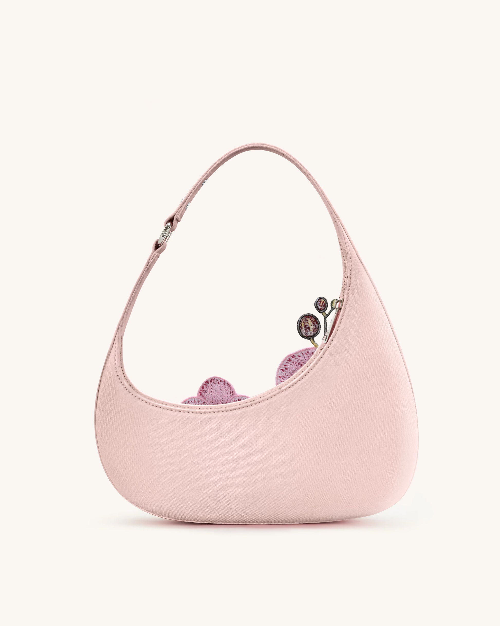 這款粉紅色肩背袋採用優雅的弧形剪裁,配上奪目的蘭花刺繡,展現鮮明的花卉風格。選用帶有質感的布料打造,袋身挺括,是日常配搭中帶點藝術氣息的理想之選。
