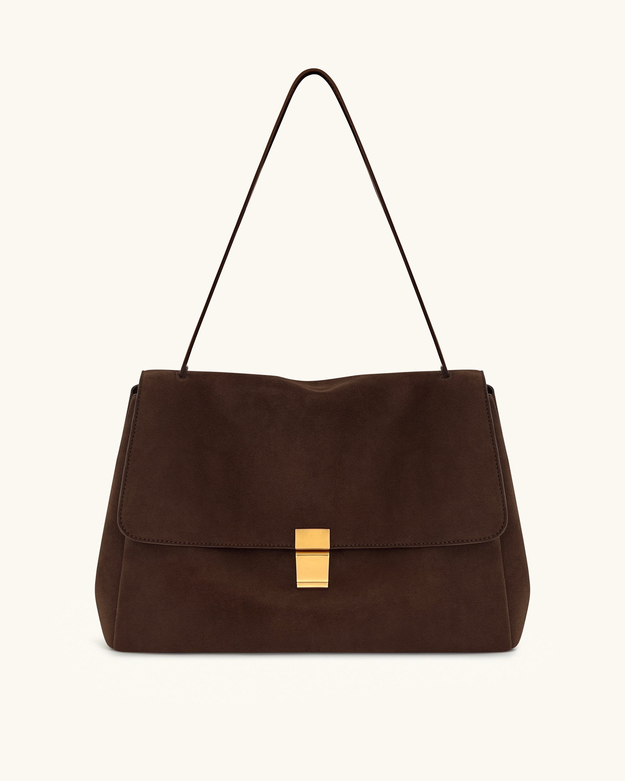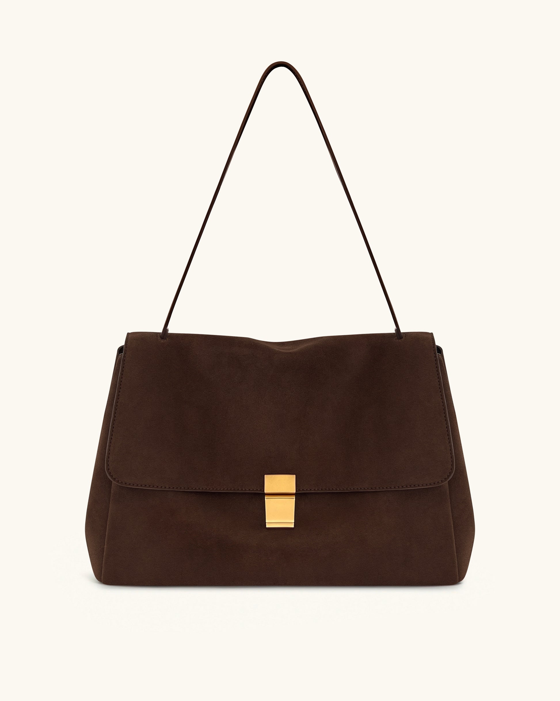 這款時尚肩背袋擁有奢華仿絨面質感,呈現濃厚深棕色調。配備結構感輪廓、金色扣環及幼肩帶,為你的日常造型帶來含蓄優雅。