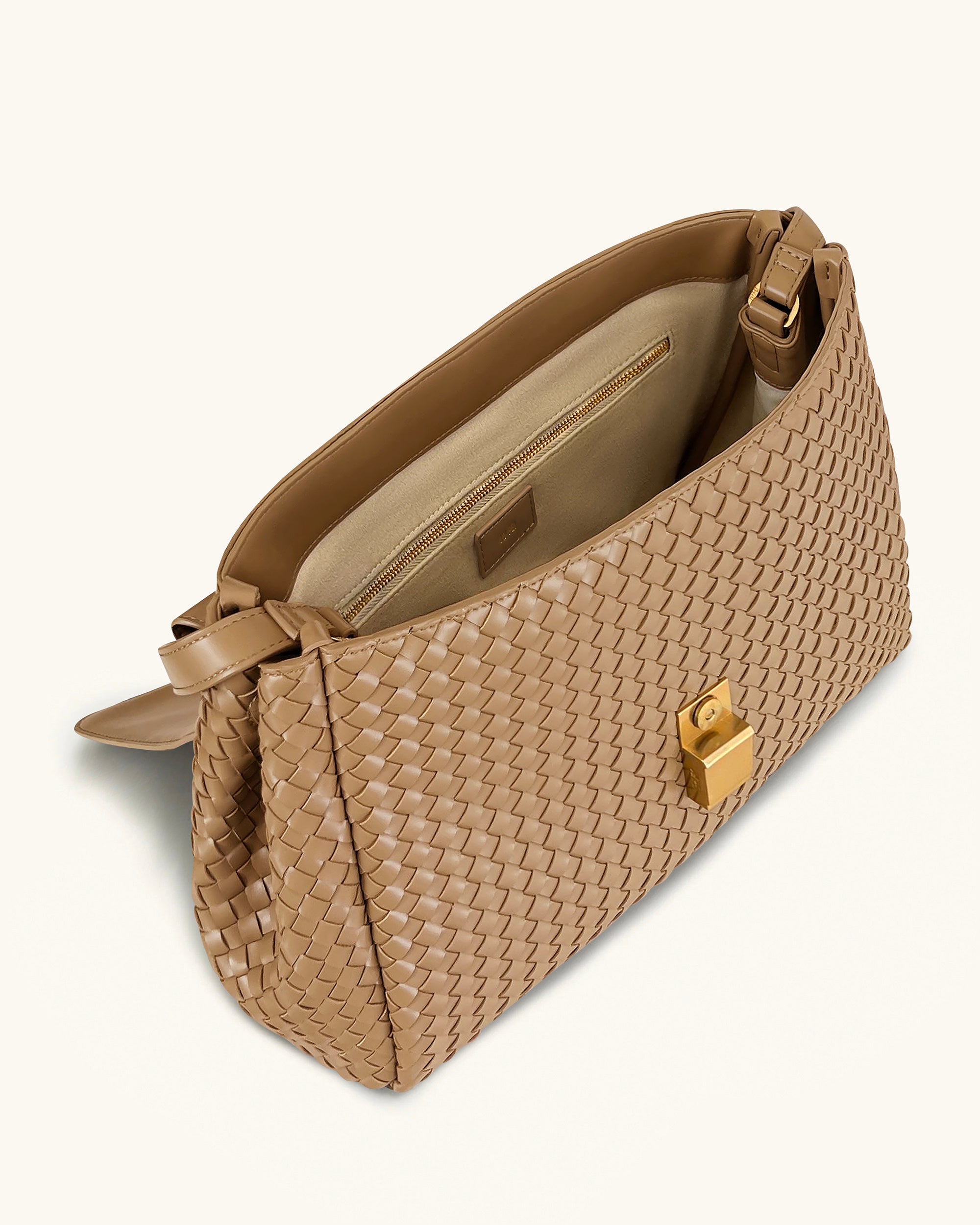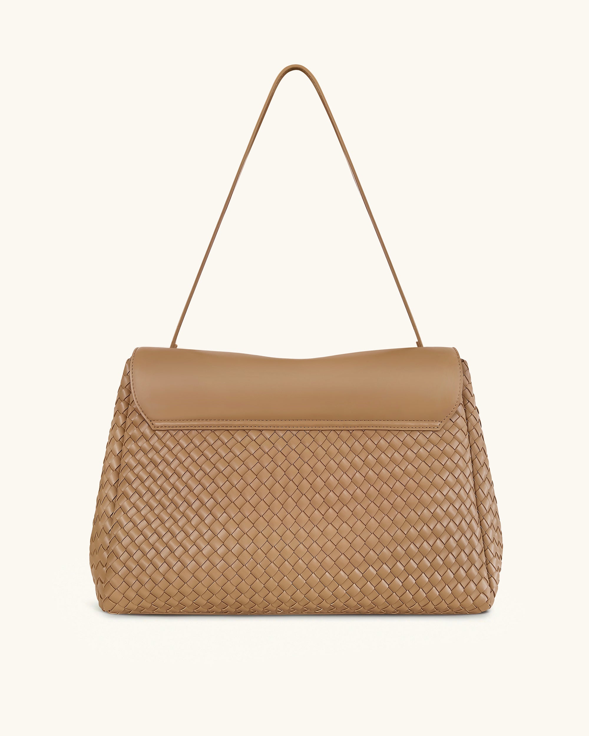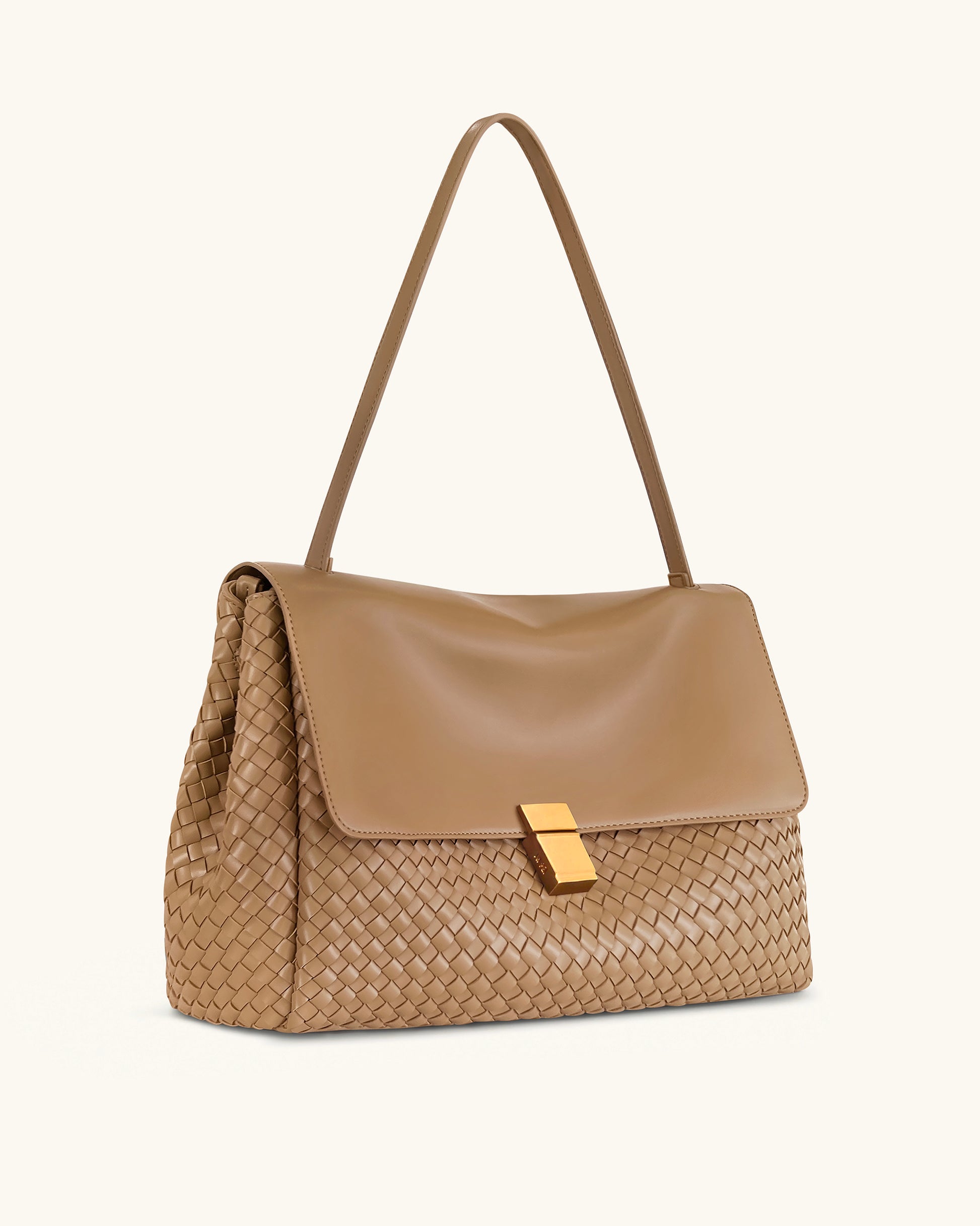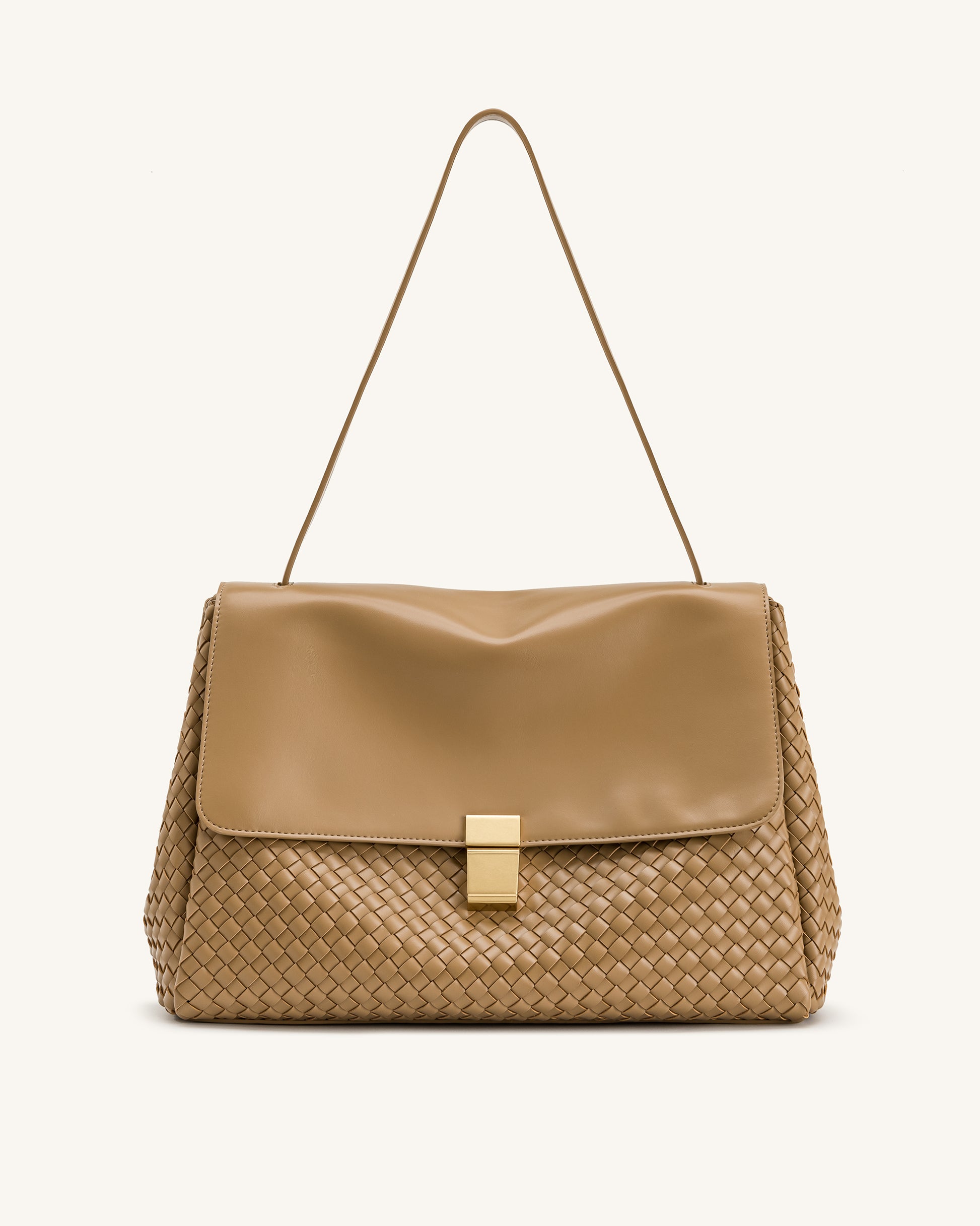 這款優雅的肩背袋配備柔軟仿皮掀蓋及溫暖駝色編織底部。結構感輪廓、金色扣環與幼肩帶,完美融合現代精緻與傳統工藝。