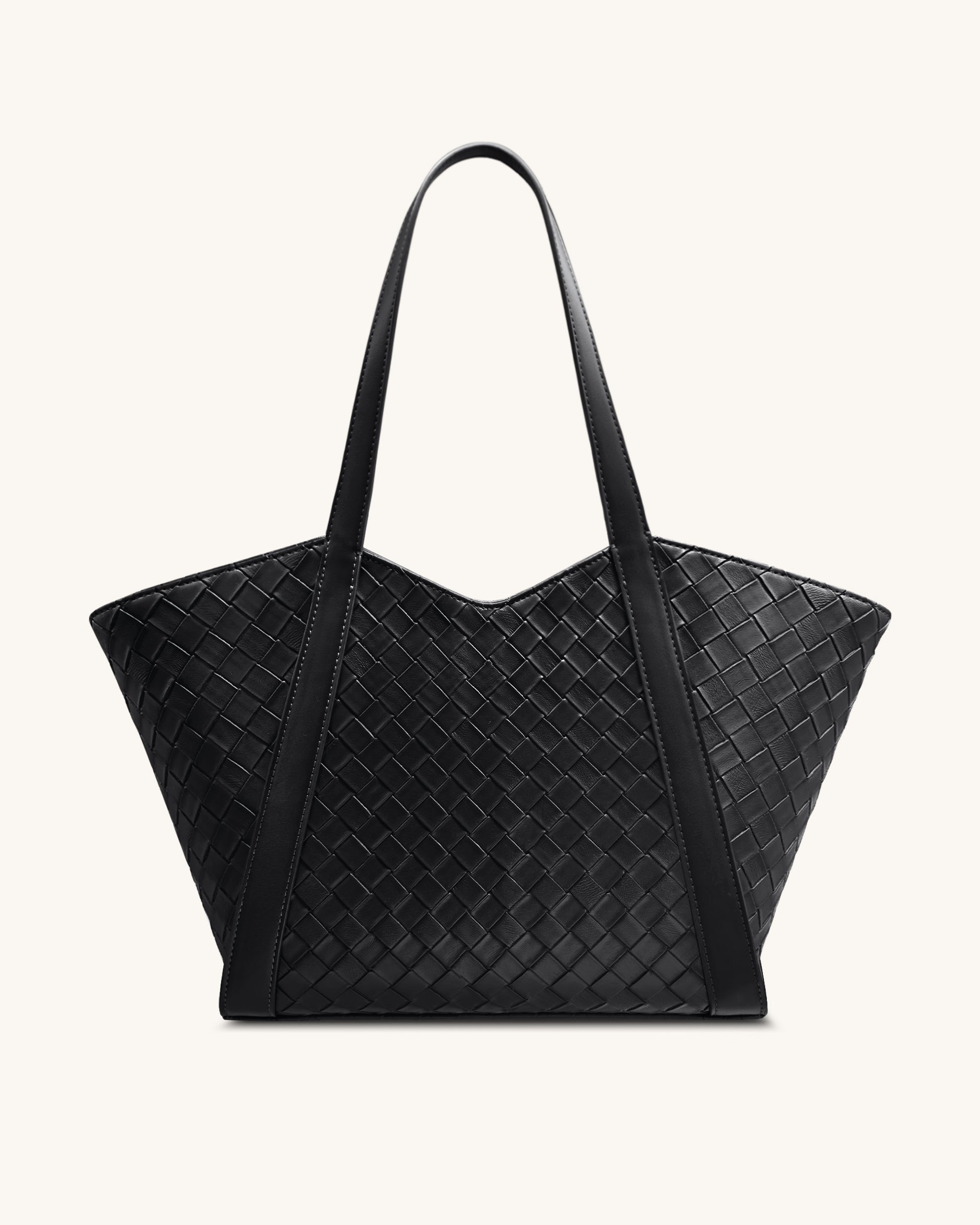 這款超大容量黑色托特袋具備流暢梯形輪廓及仿編織紋理,增強視覺層次感。闊肩帶及寬敞內籠設計,適合通勤、購物或旅遊,結合實用與時尚。
