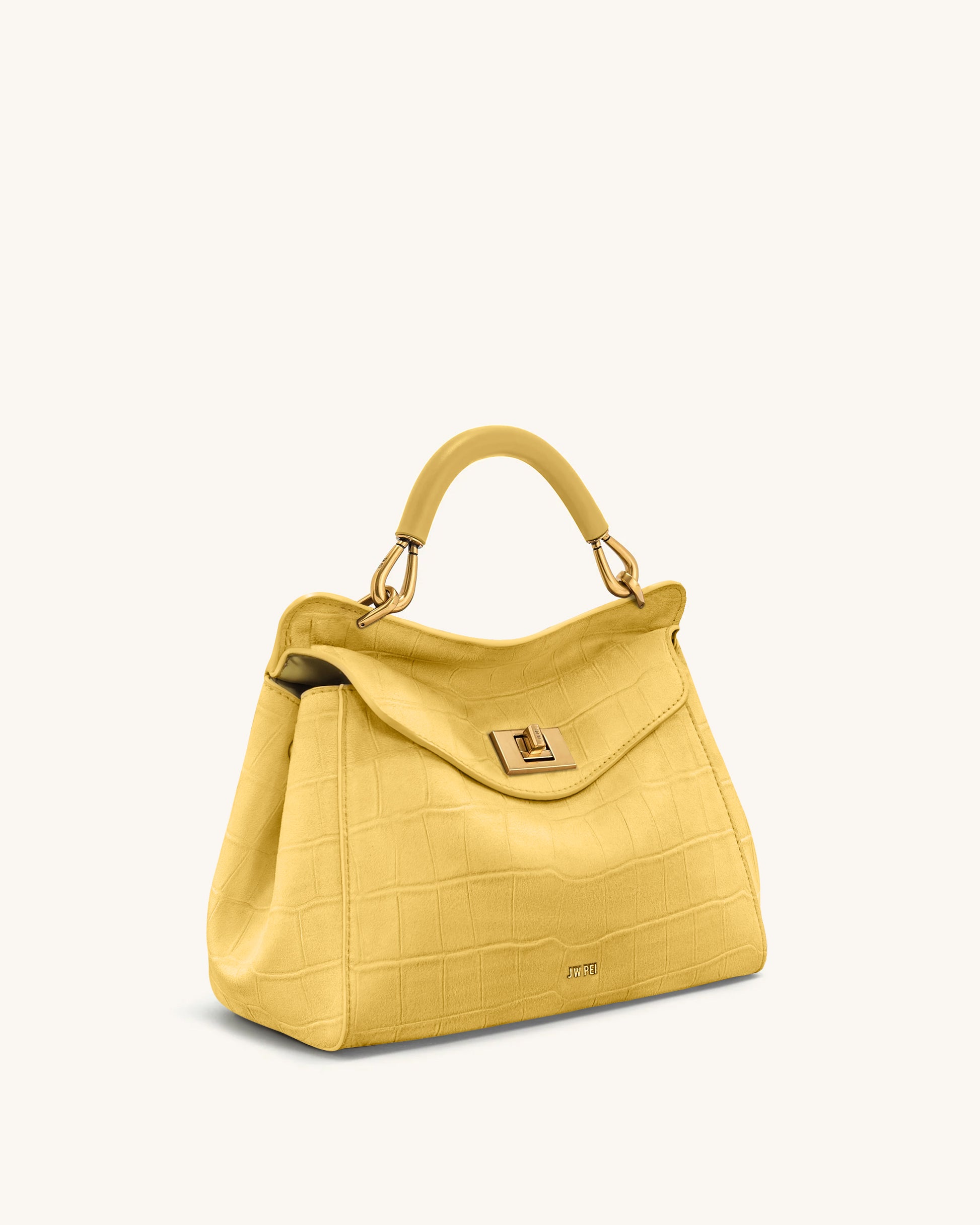 這款亮眼的手挽包採用溫暖黃色調,配以柔軟鱷魚壓紋絨面質感。金色旋鎖、結構感手柄及可拆卸斜揹帶的設計,將復古風格與現代實用性完美結合,是提升日常造型的理想之選。