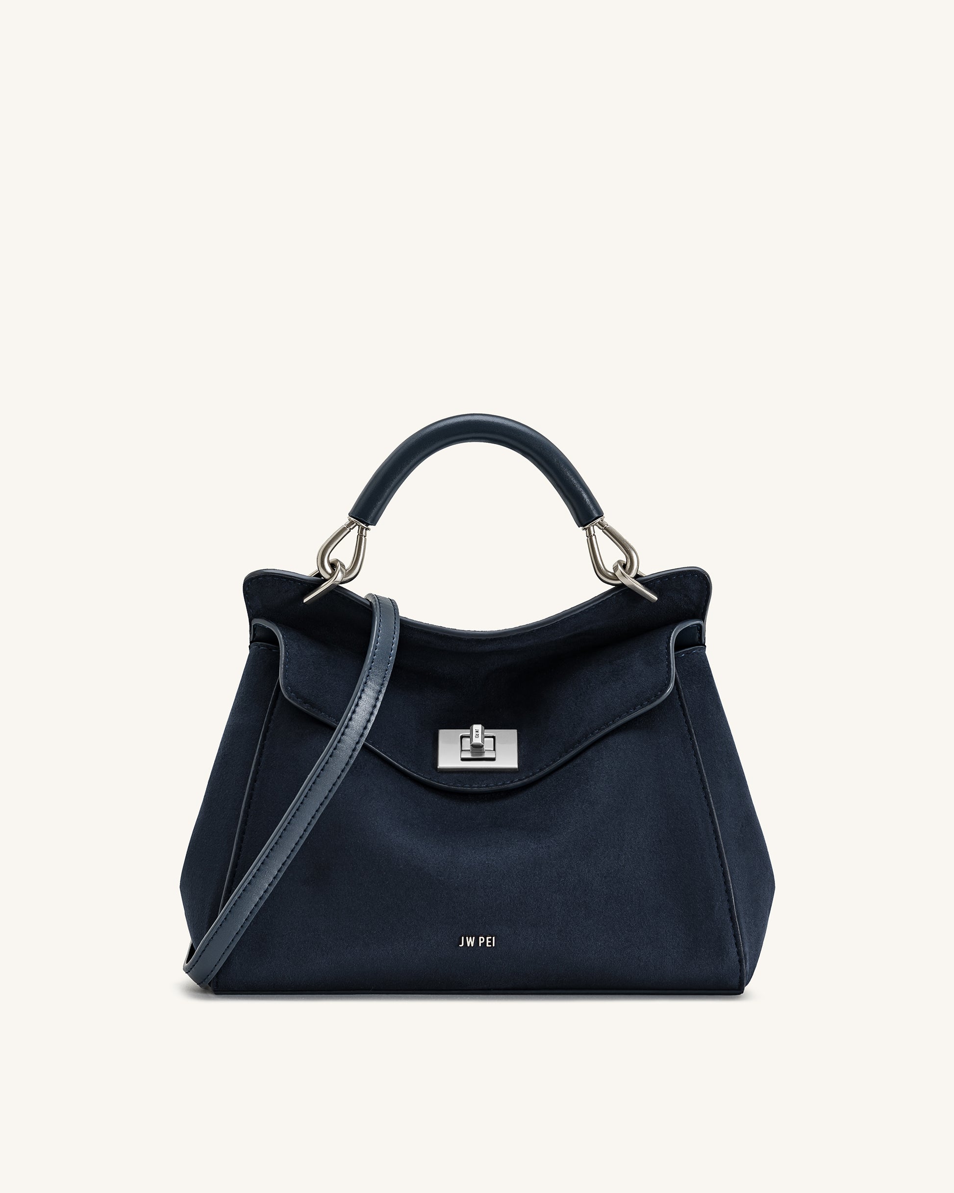 這款優雅的手挽包採用經典海軍藍色,擁有柔軟絨面質感及光滑銀色旋鎖扣。設計配備結構感手柄及可拆卸斜揹帶,結合經典優雅與日常實用,適合工作、會議或城市漫步。