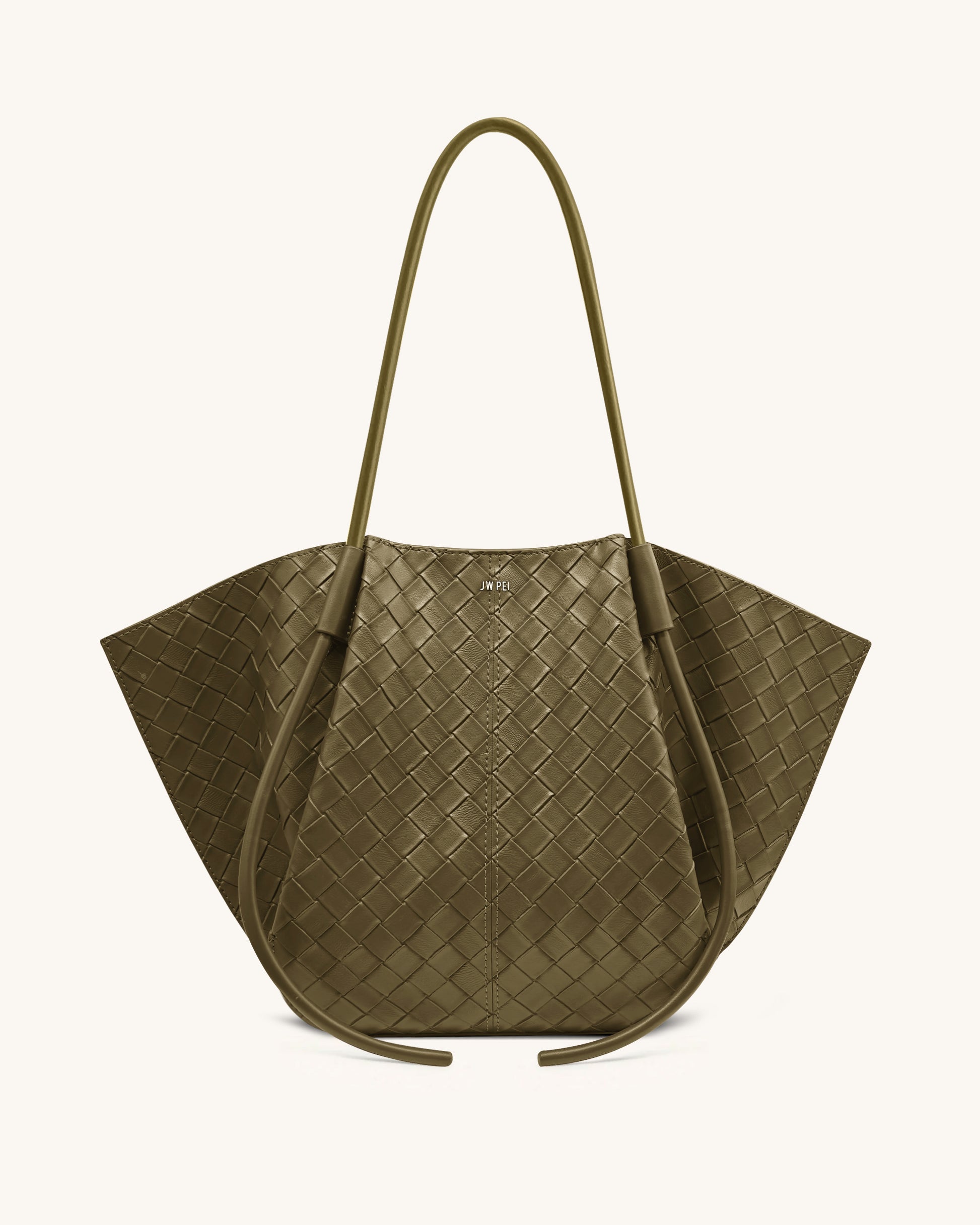 簡約實用的橄欖綠編織托特袋。柔軟素皮革與寬闊優雅輪廓。配備長肩帶,方便多種攜帶方式。