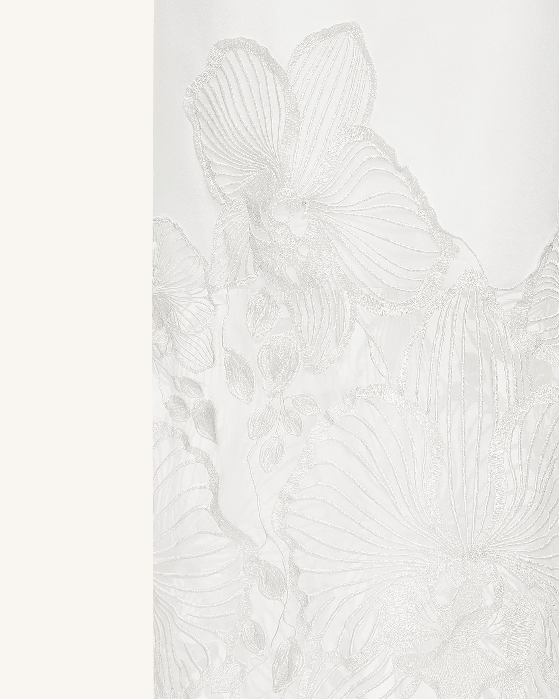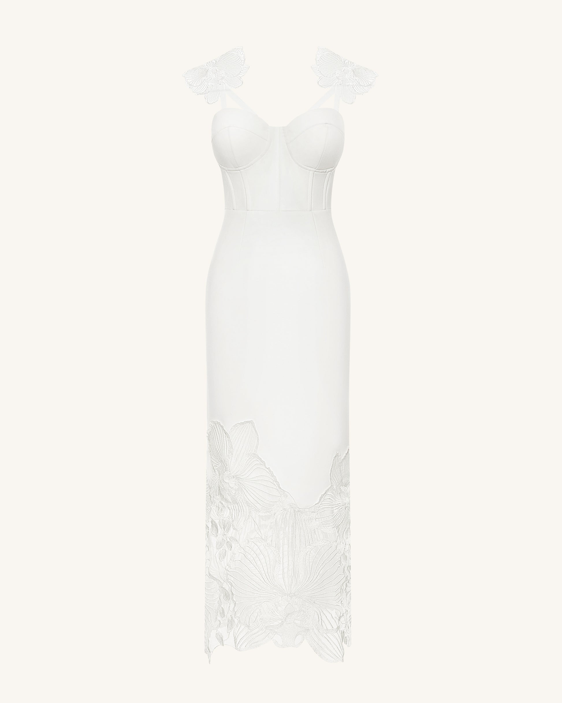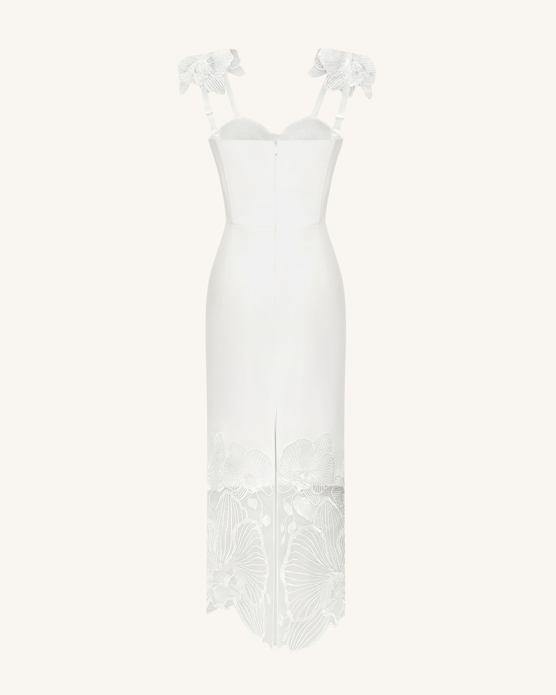這款高雅的白色中長裙設計採用馬甲式立體胸杯,細肩帶飾以立體花卉貼花,展現細緻工藝。貼身剪裁勾勒身形曲線,裙擺則以精緻的透視花卉刺繡作點綴,增添浪漫氛圍與層次質感。非常適合婚禮場合、花園派對或高雅晚宴穿搭。