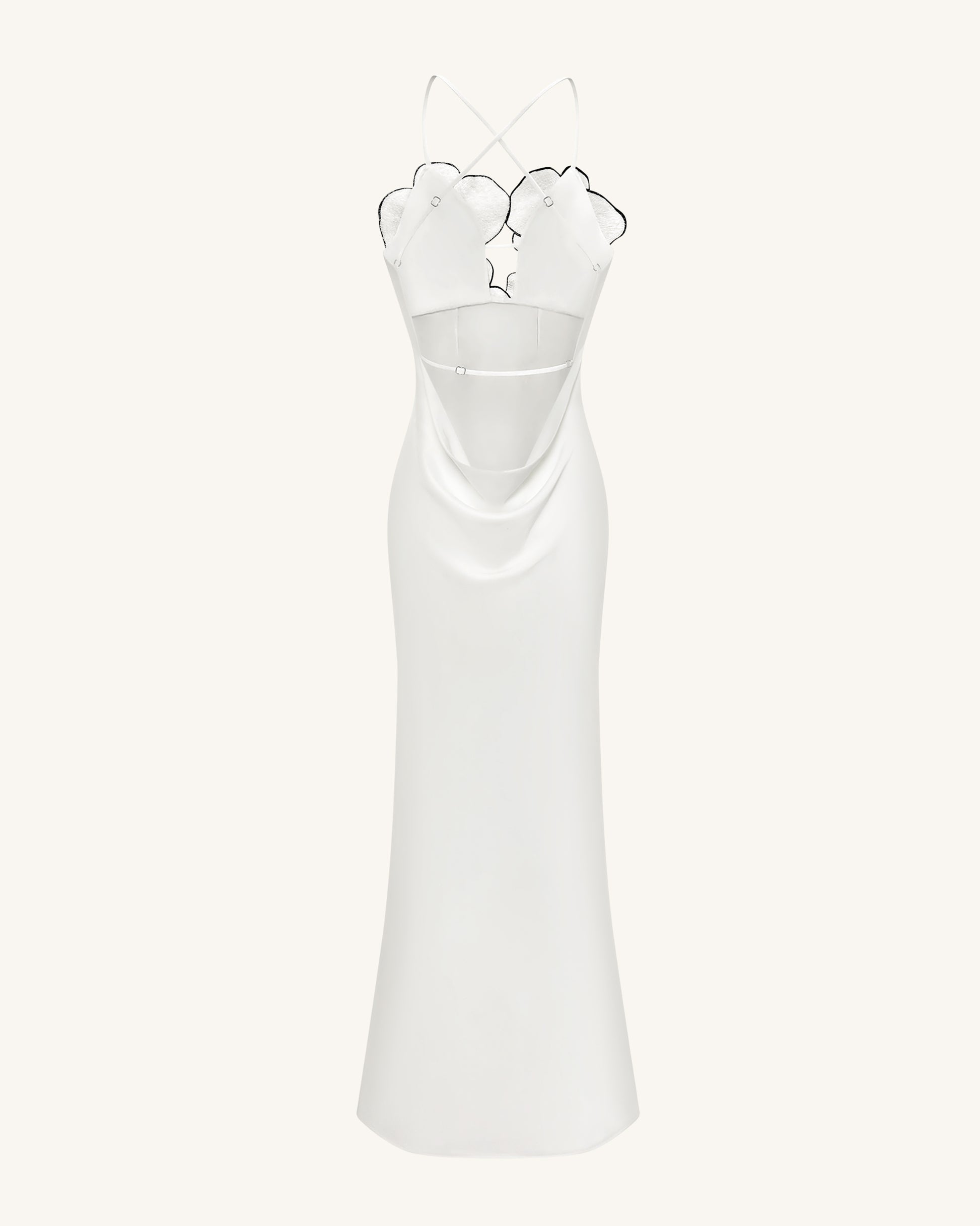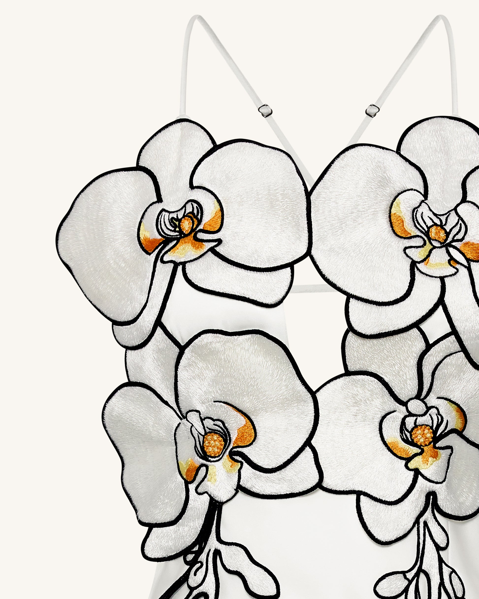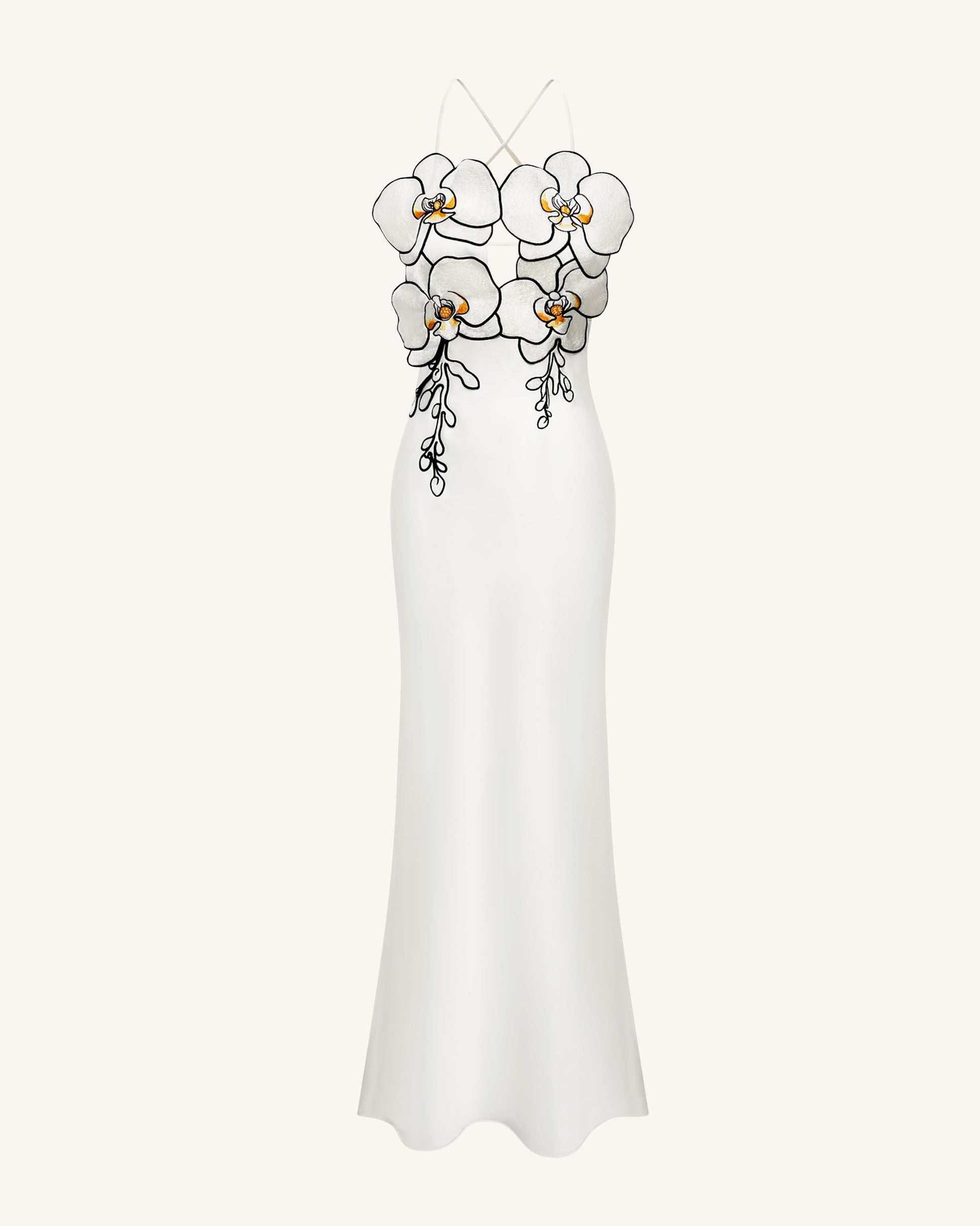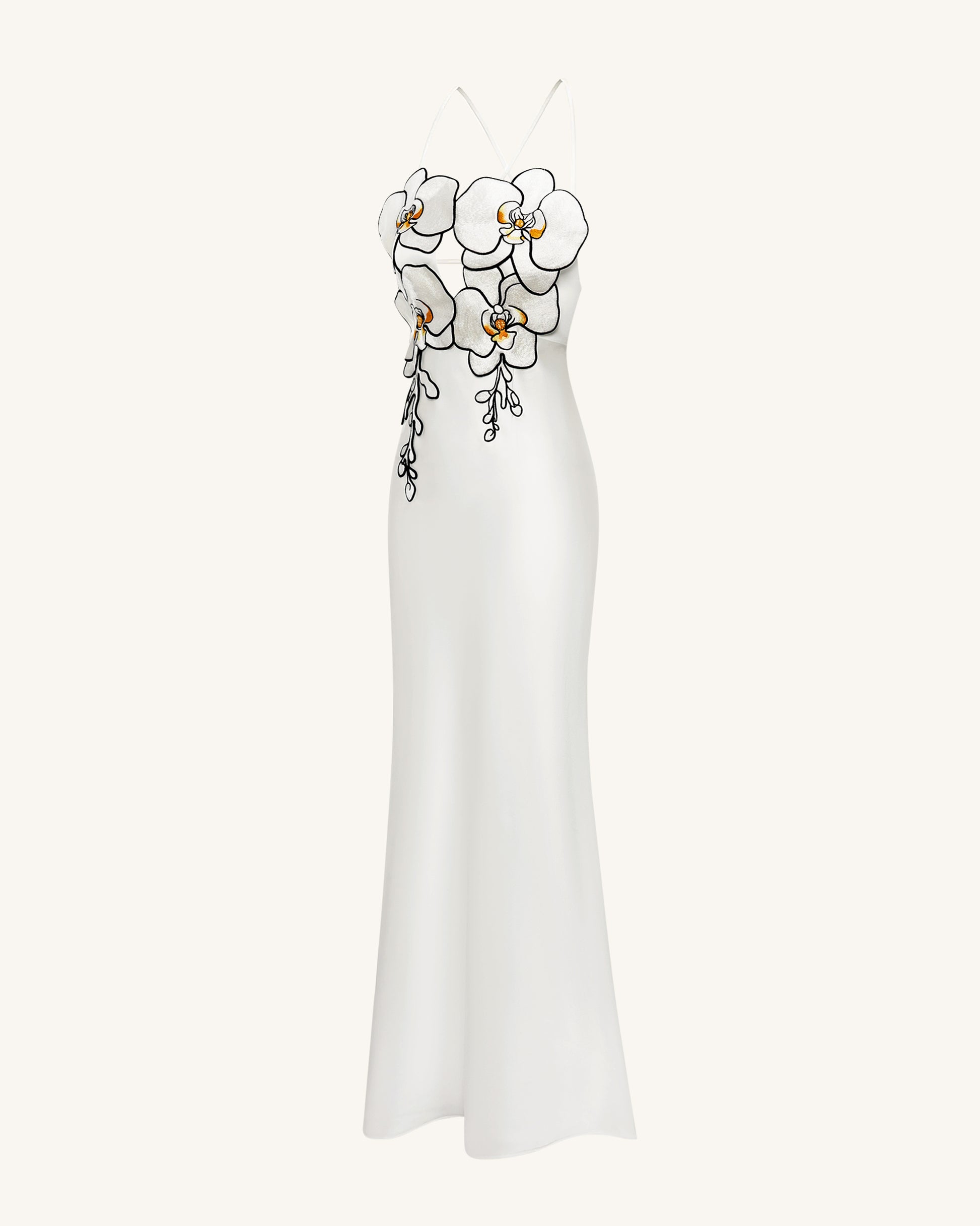 這件華麗的白色晚裝裙,胸前綴有大膽的蘭花刺繡,展現迷人的3D花卉立體感。貼身剪裁及側邊開衩添上優雅感覺,交叉帶露背設計更增添性感魅力。非常適合正式活動、紅地毯或時尚前衛場合穿著。