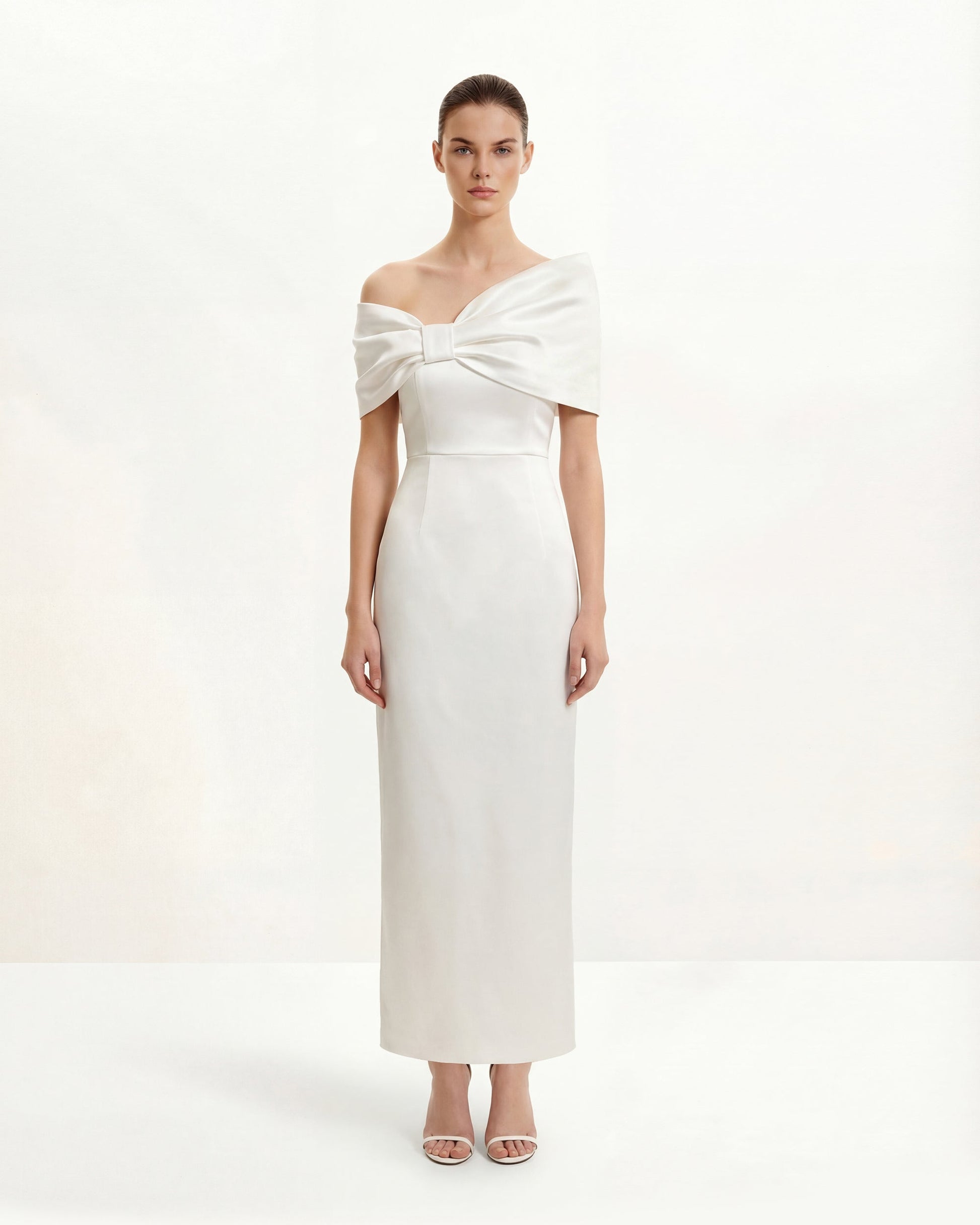 緞面不對稱蝴蝶結長連身裙 - 白色
