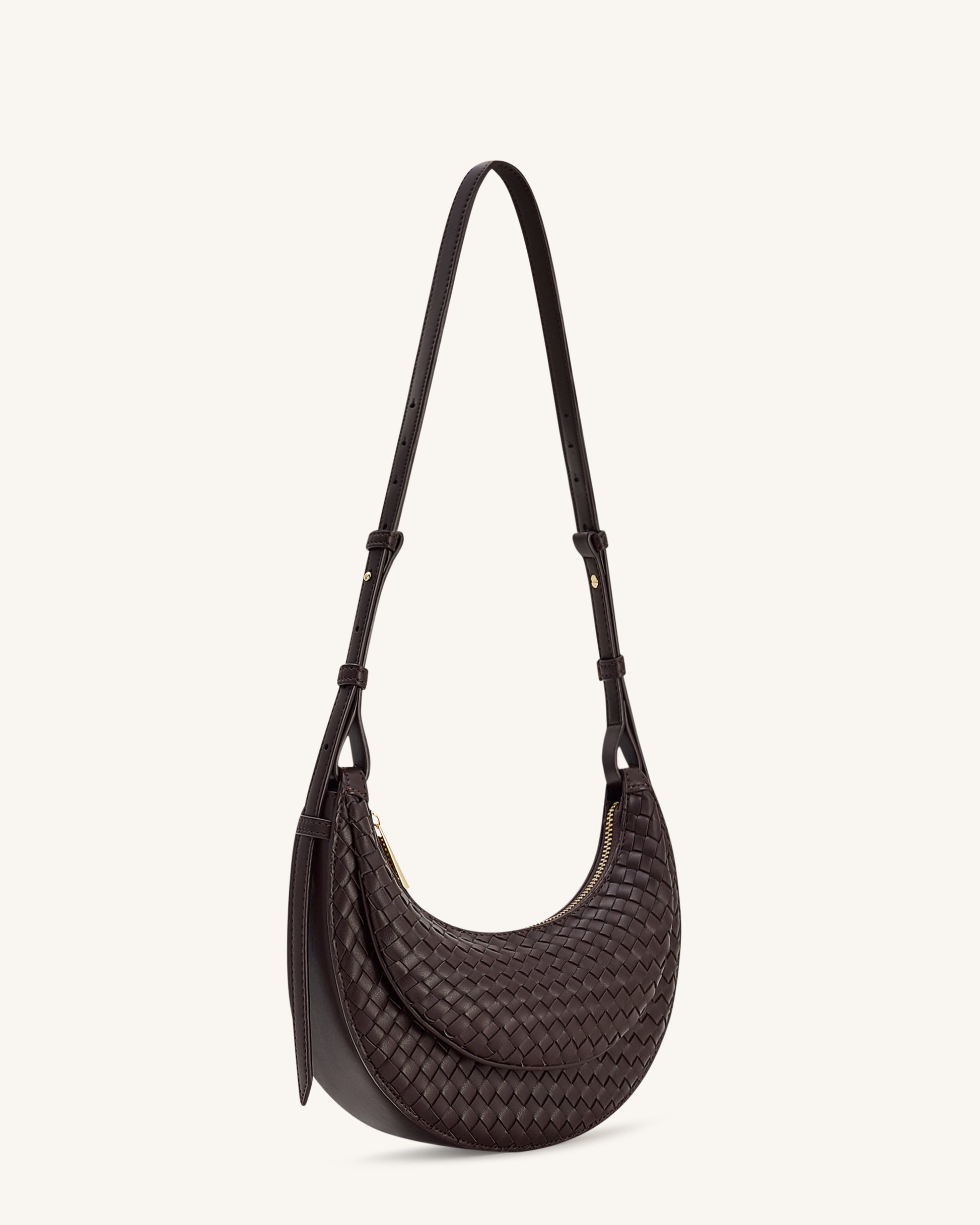這款袋具有編織紋理,展現時尚造型。採用素皮革製成,內裡為柔軟麂皮。金色五金增添優雅氣息。可調校肩帶可肩背或斜揹,並可放入 iPhone 16 Pro Max。