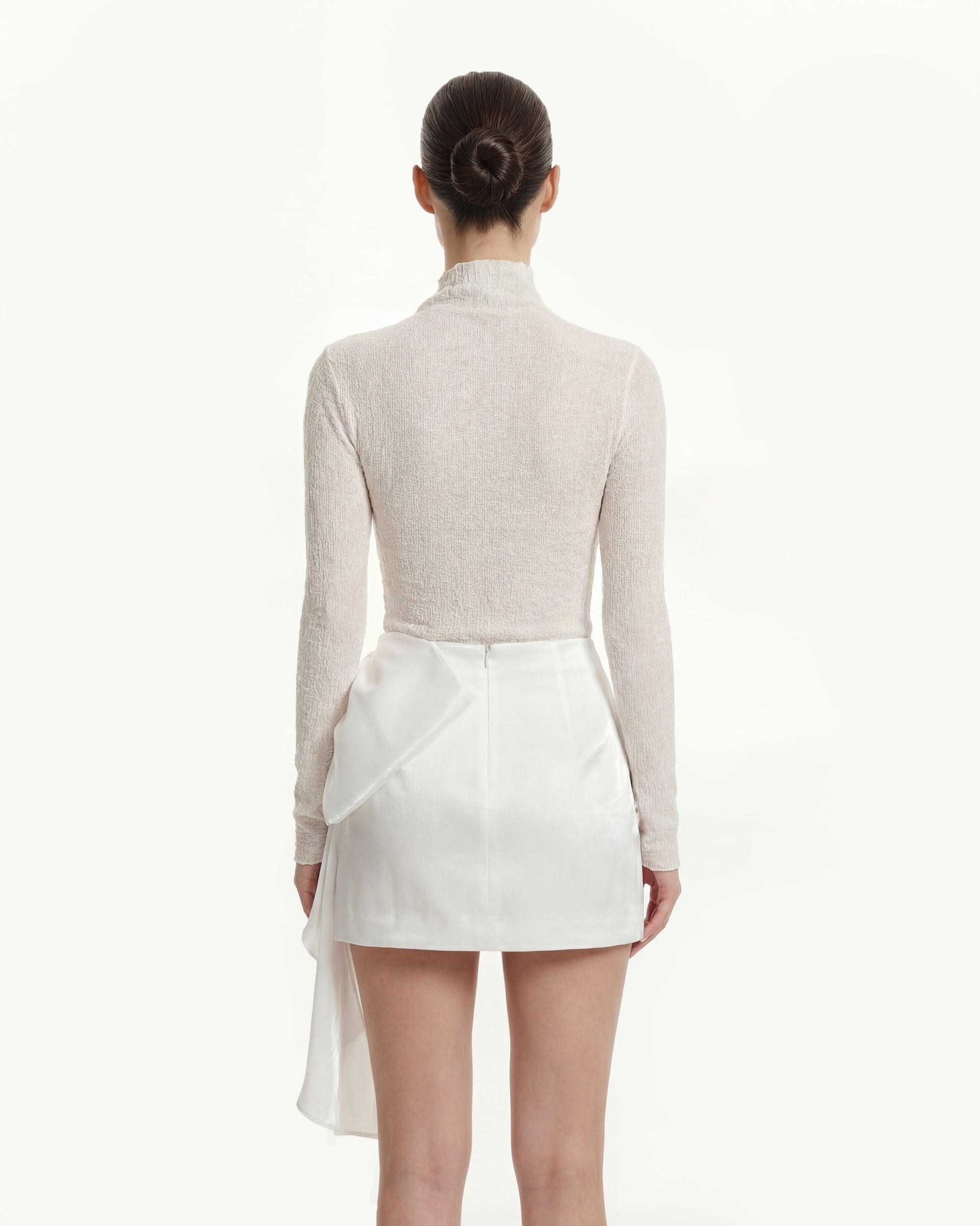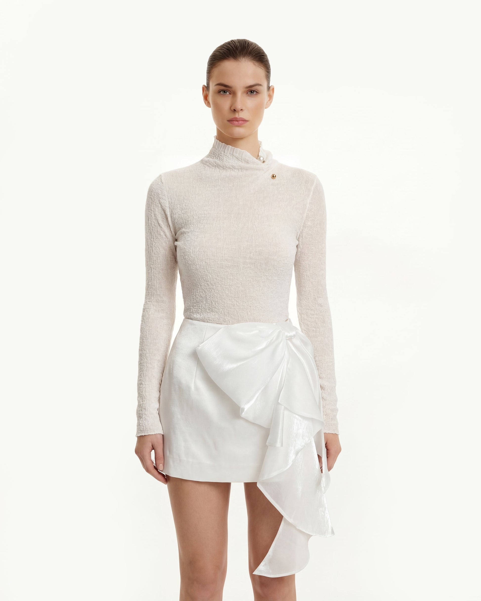 紋理高領針織上衣飾金屬鈕扣 - 白色