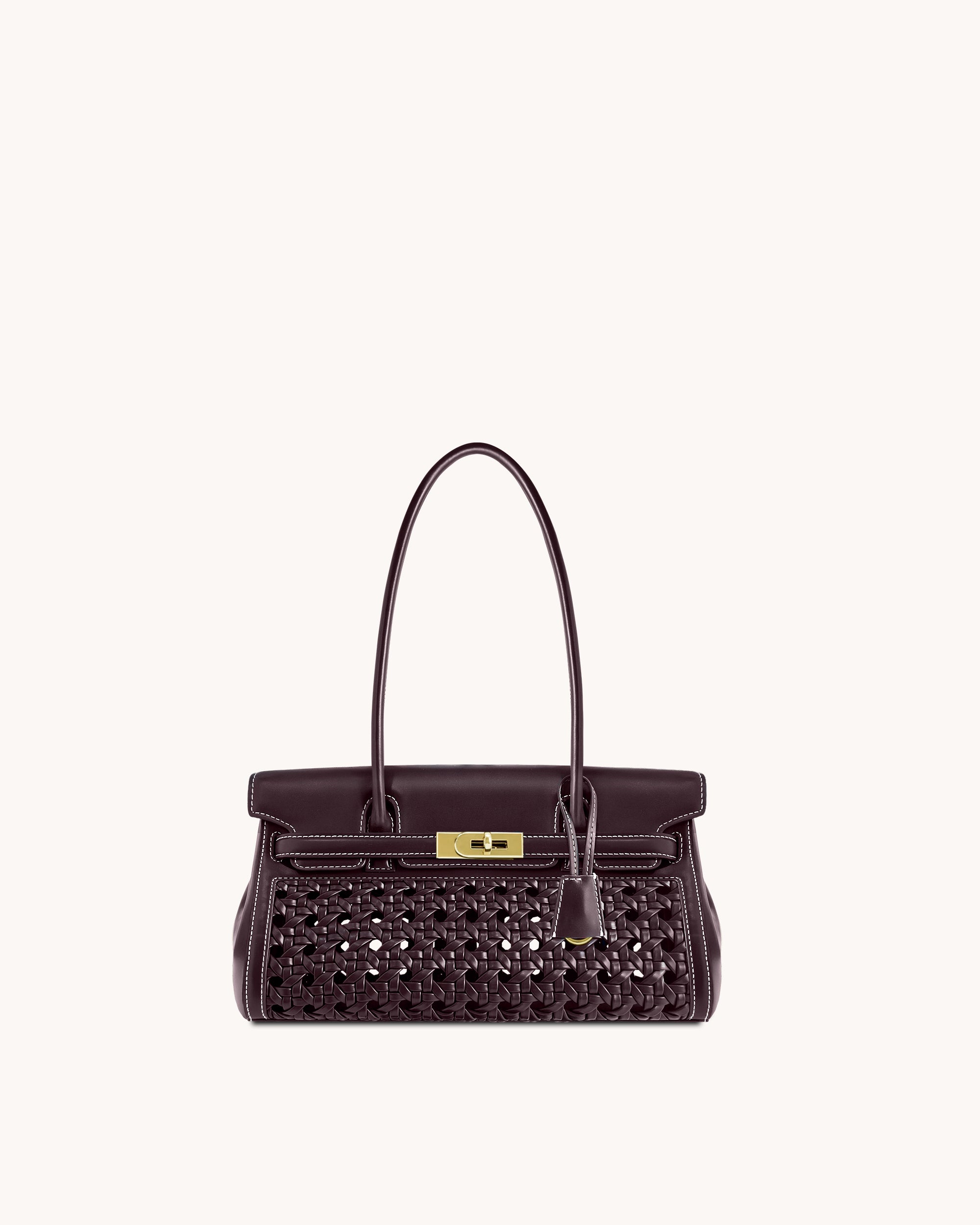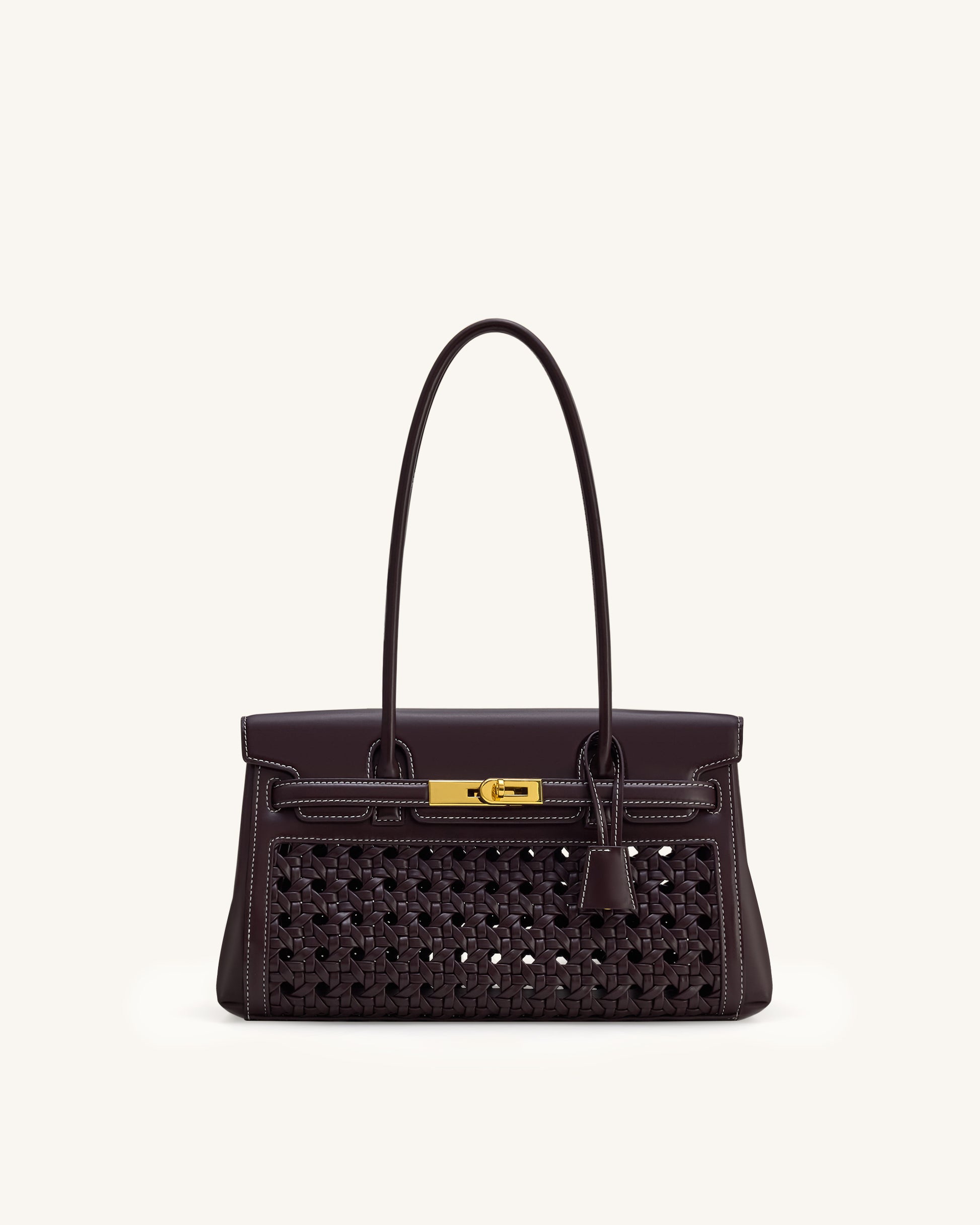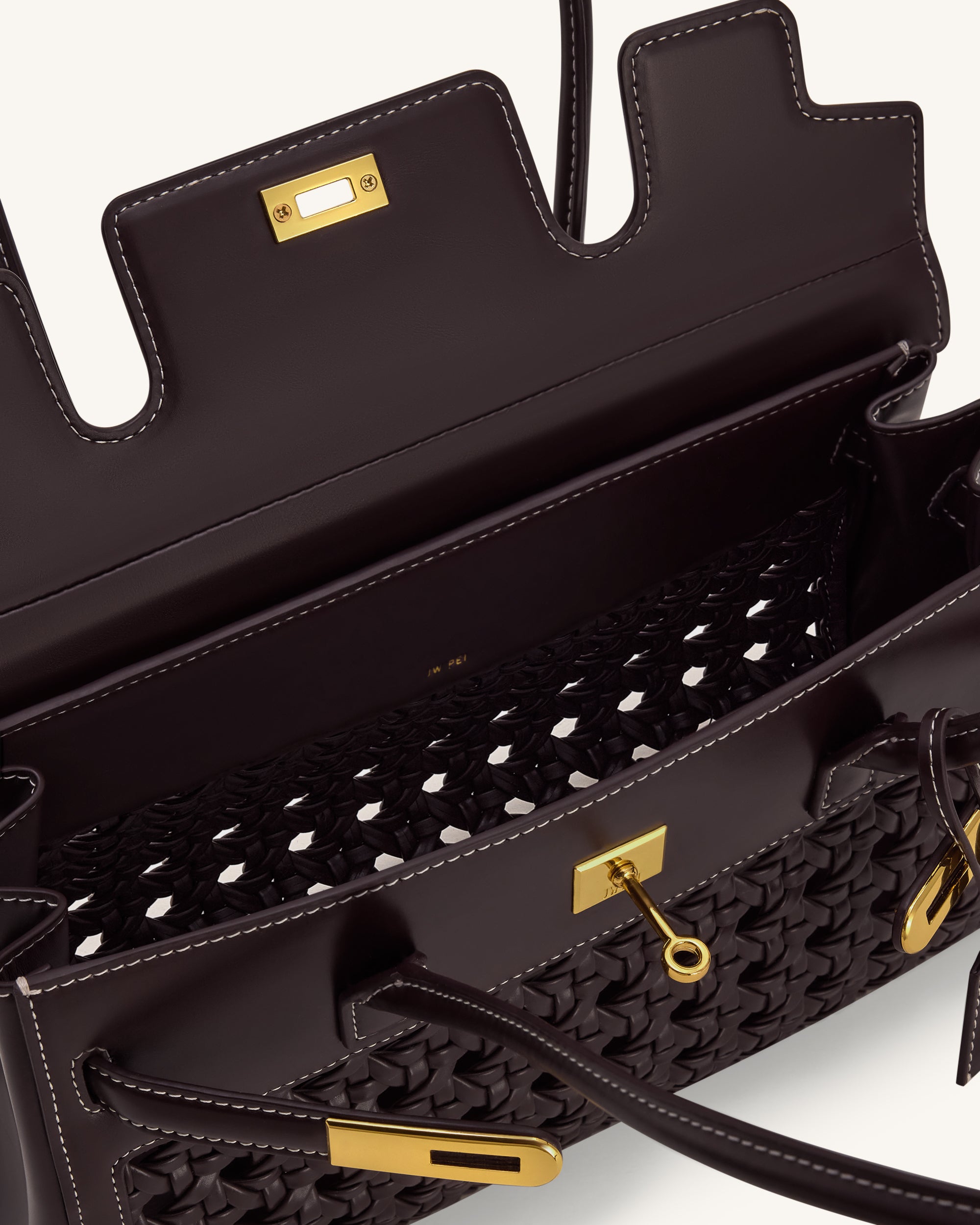 優雅手挽袋,前幅織紋設計,配搭金色金屬配件。容量寬敞、結構分明且時尚,適合日常或辦公場合使用。質感細膩光滑,外觀高雅,百搭且具現代感。