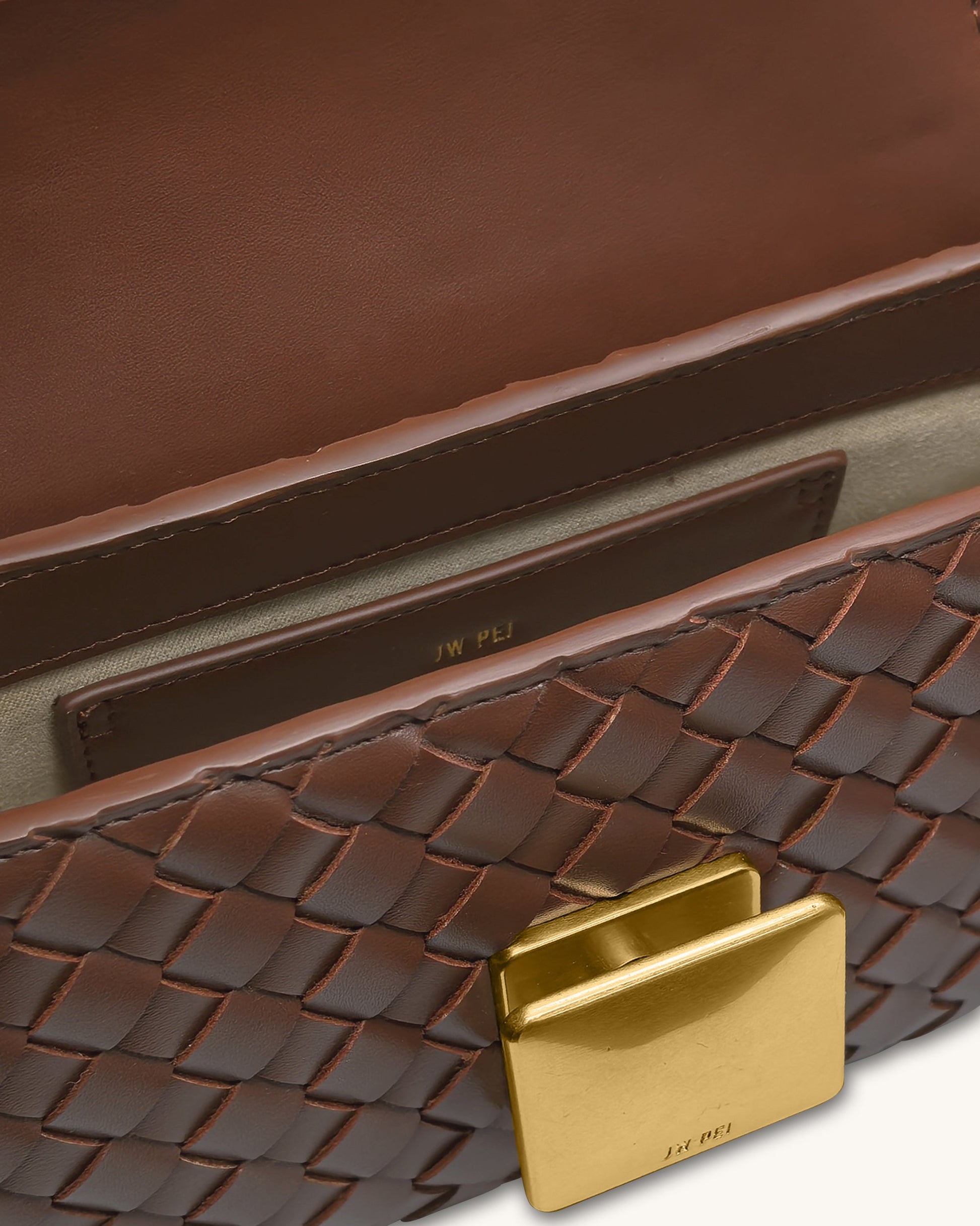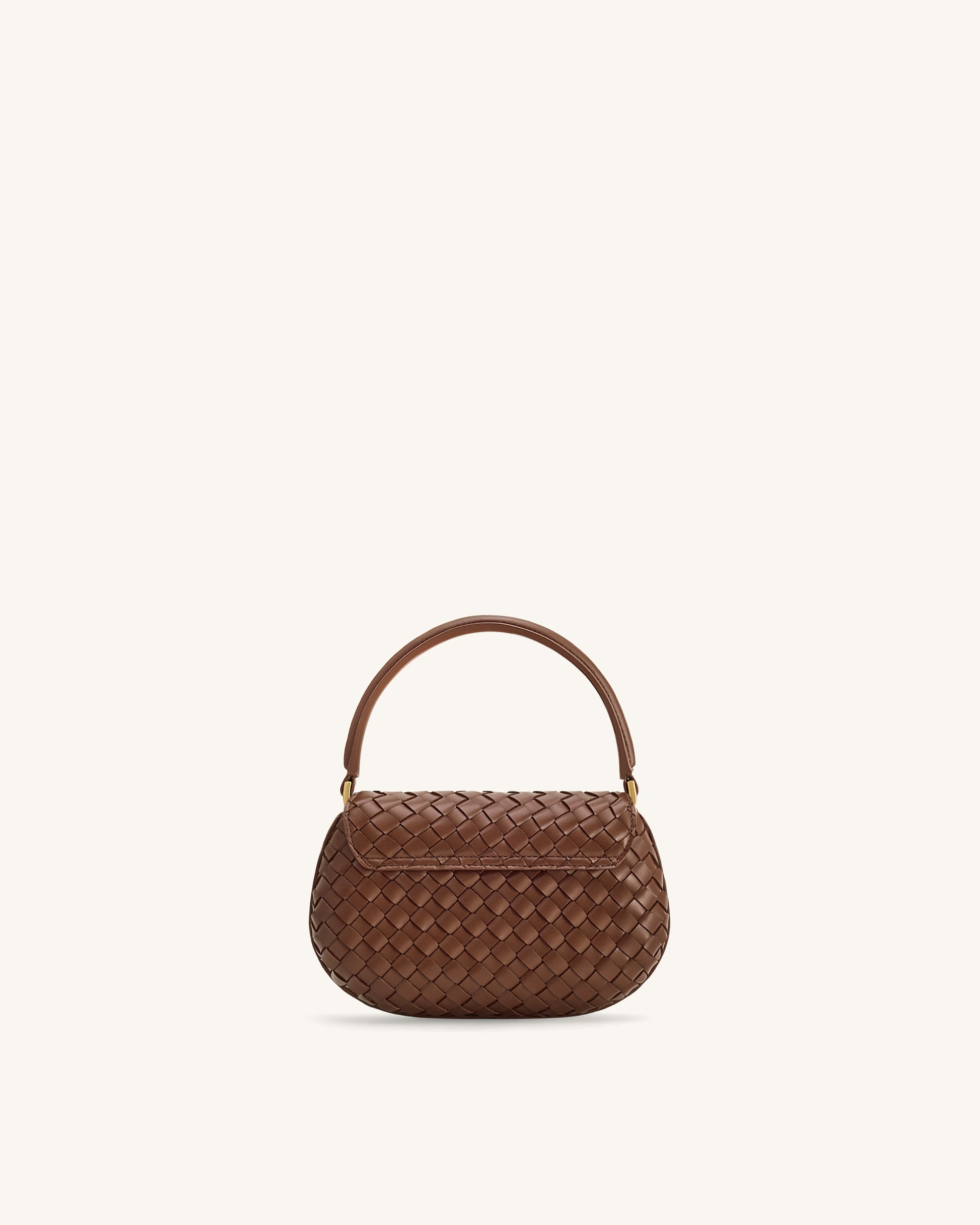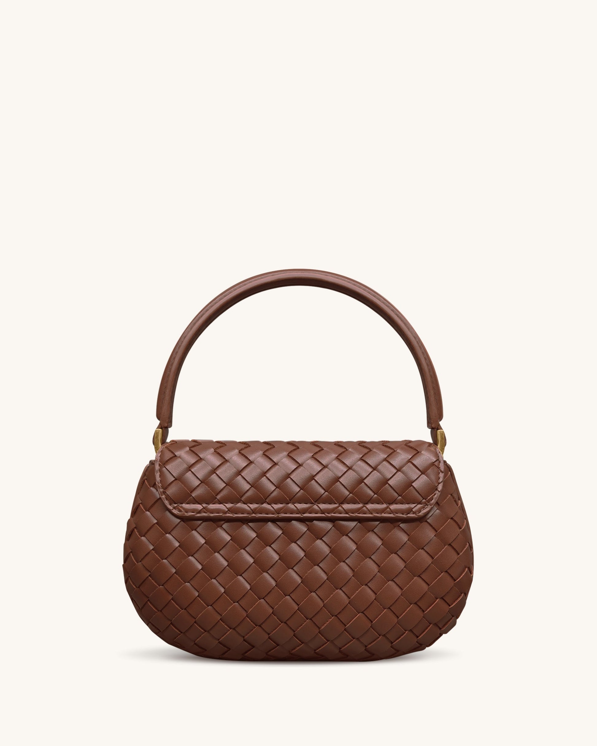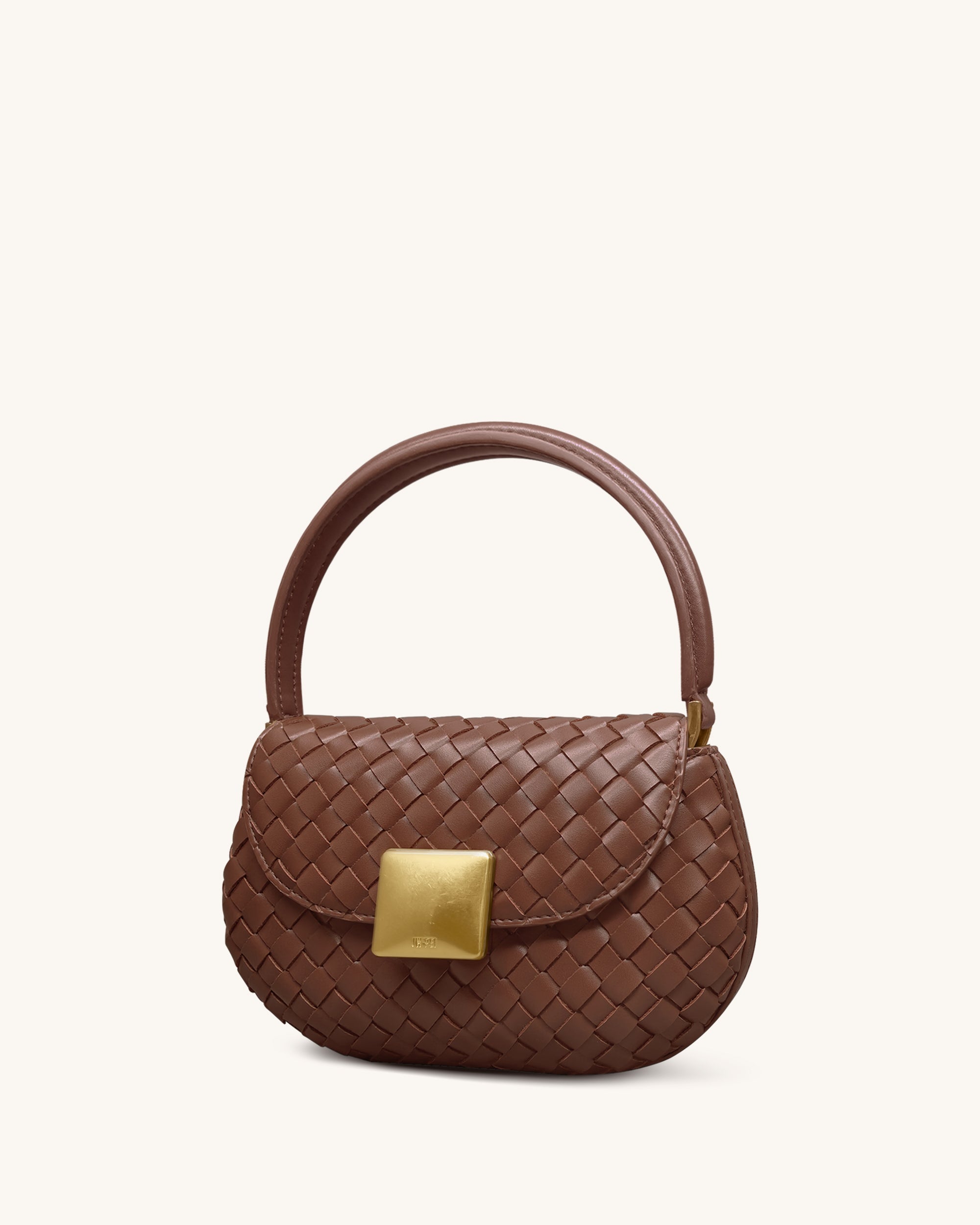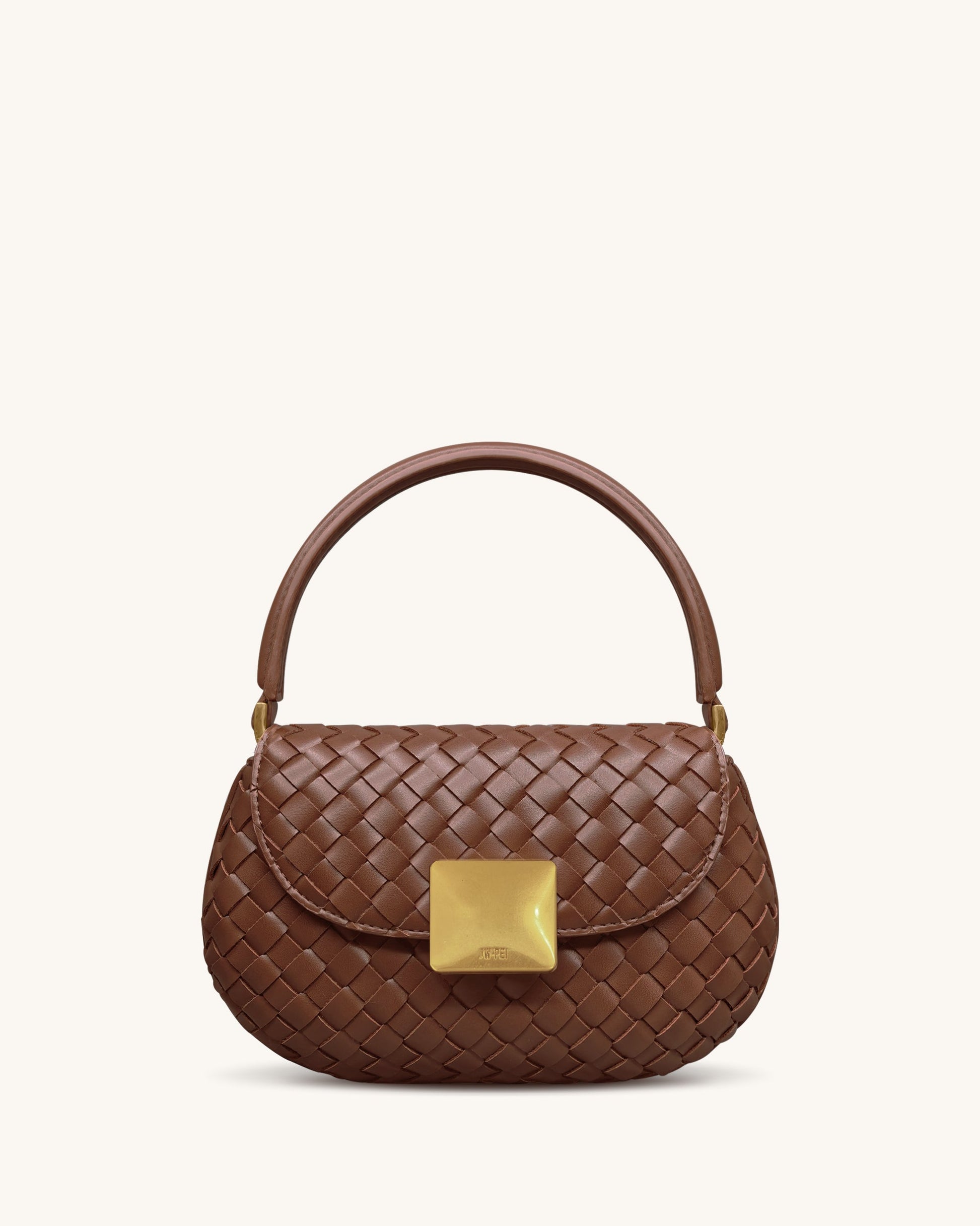這款啡色編織皮革手挽袋採用結構化剪裁,配以圓形手挽和以醒目方形金色扣環裝飾的翻蓋設計。其經典設計融合手工質感與現代優雅,適合日常使用及特別場合。